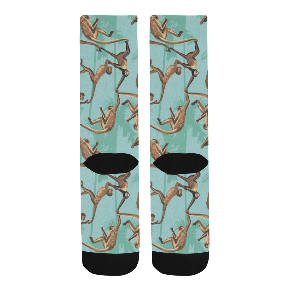 Monkey Palm tree background Crew Socks are uniqued design and limited item. It made to order, hand printed, and sewn with love in our factory.
