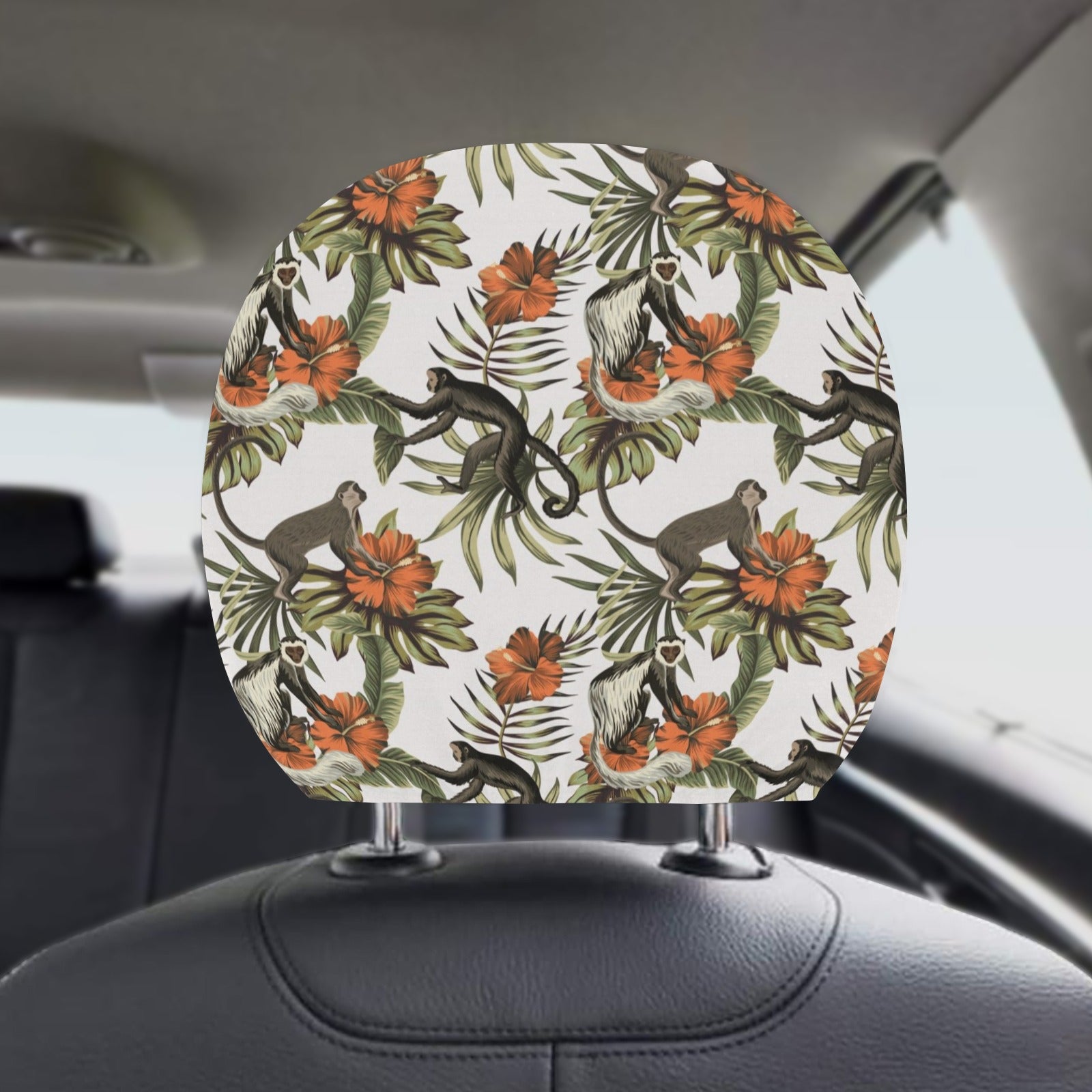 Monkey red hibiscus flower palm leaves floral patt Car Headrest Cover