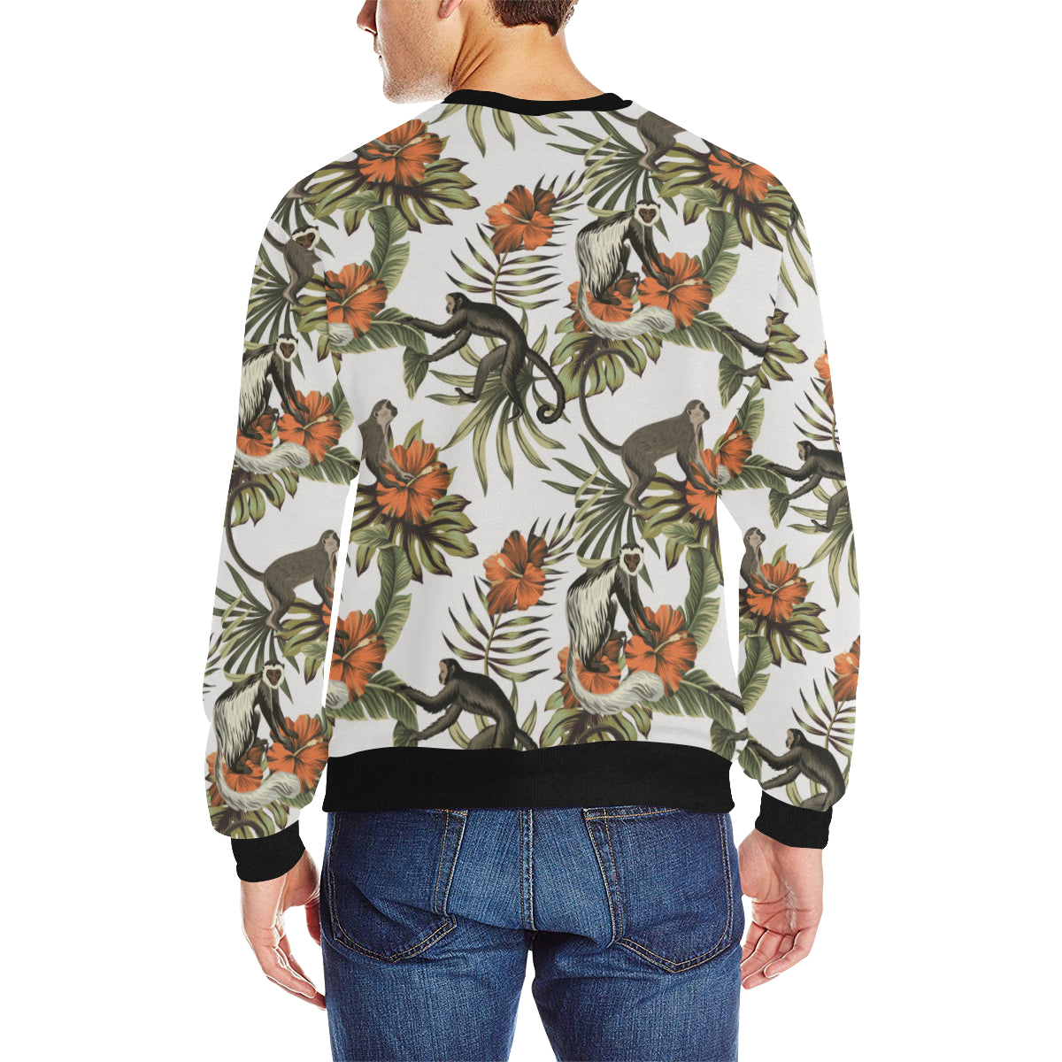 Monkey red hibiscus flower palm leaves floral patt Men's Crew Neck Sweatshirt