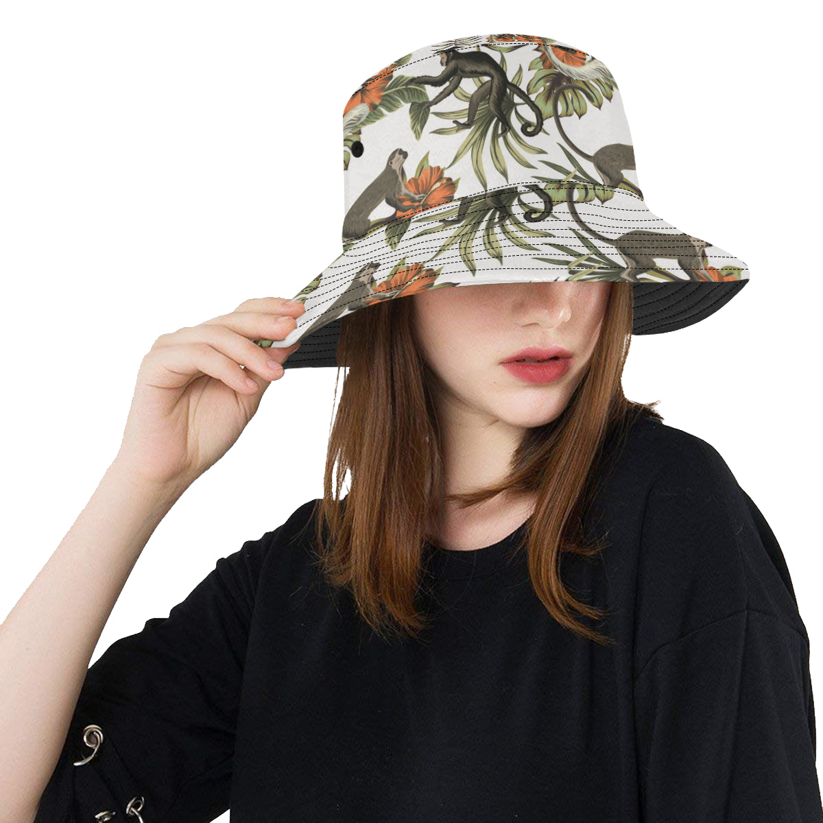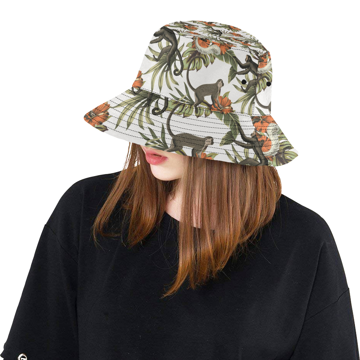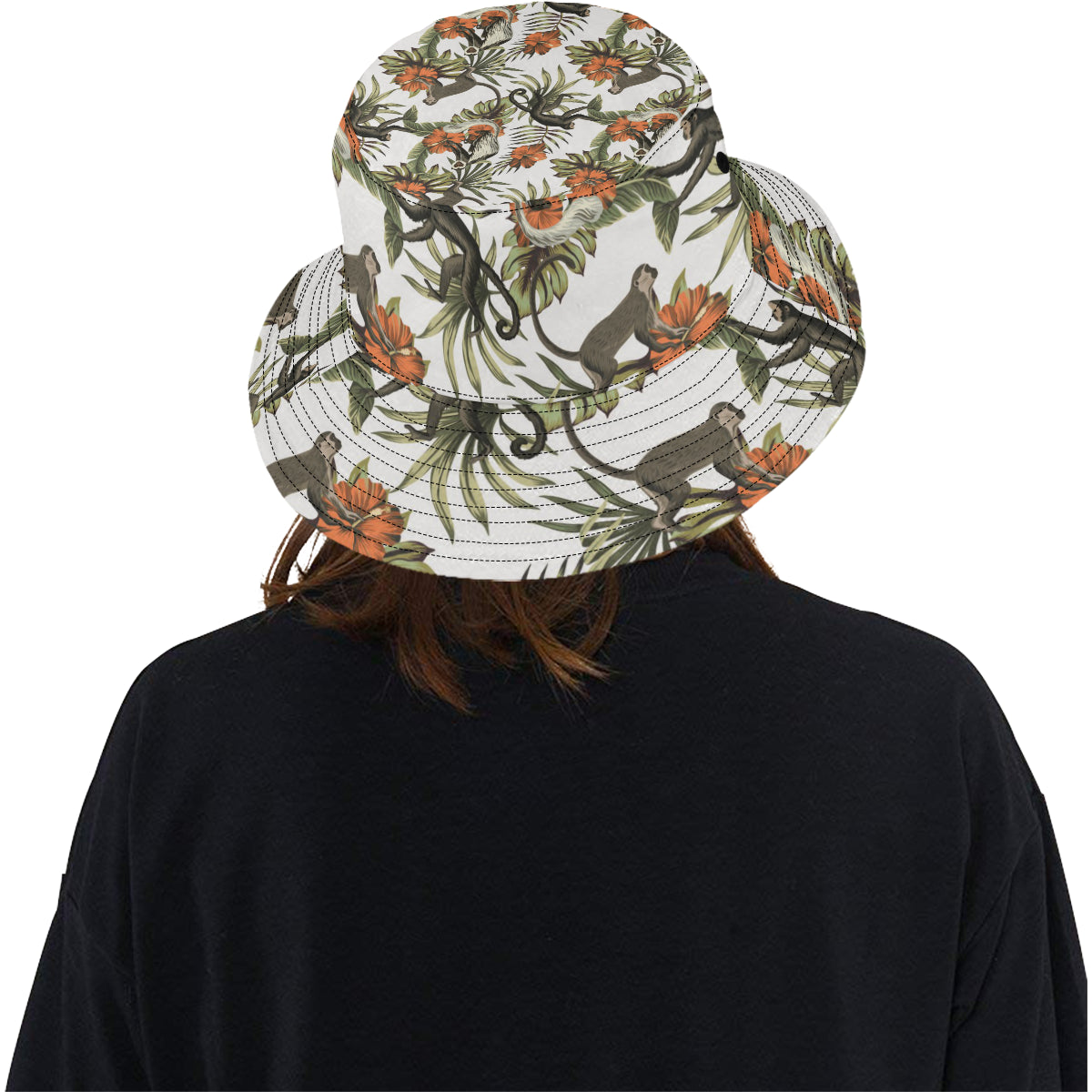 Monkey red hibiscus flower palm leaves floral patt Unisex Bucket Hat is a uniqued design and limited item. It made to order, hand printed, and sewn with love in our factory.