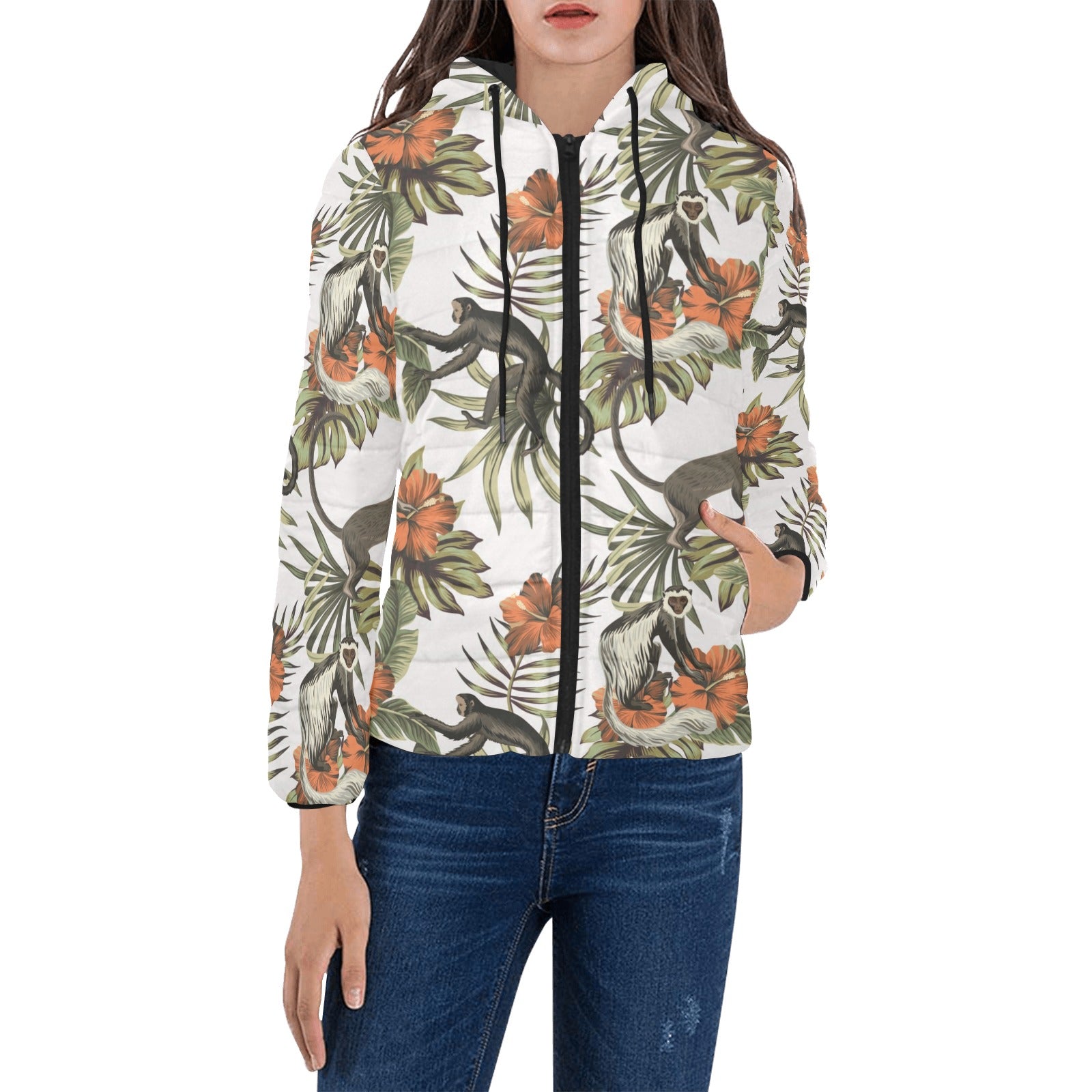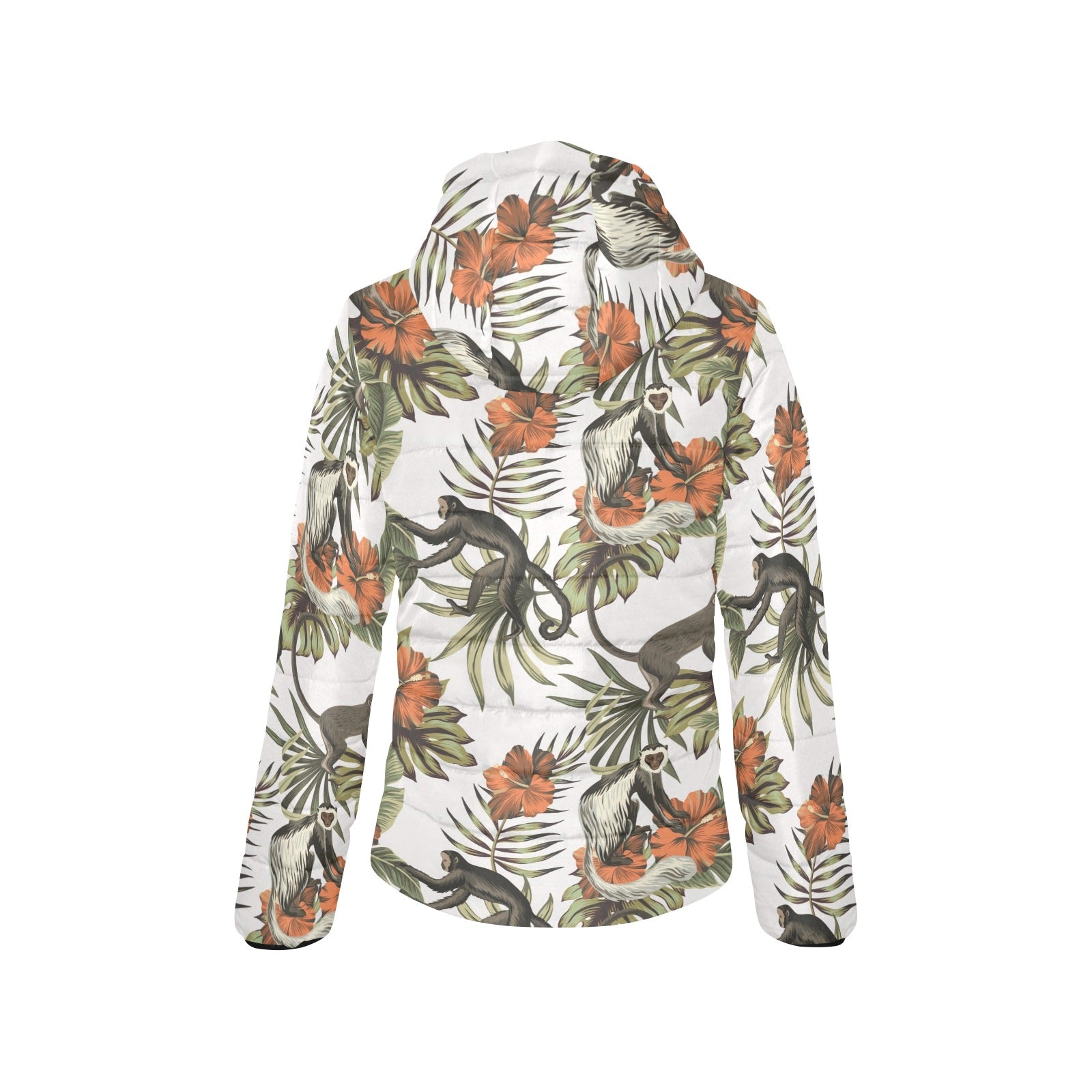 Monkey red hibiscus flower palm leaves floral patt Women's Padded Hooded Jacket