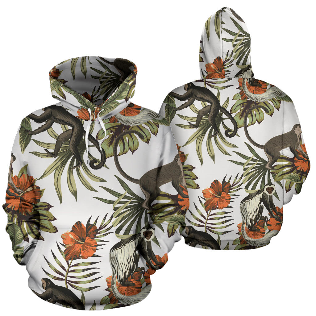 Monkey Red Hibiscus Flower Palm Leaves Floral Pattern Men Women Pullover Hoodie