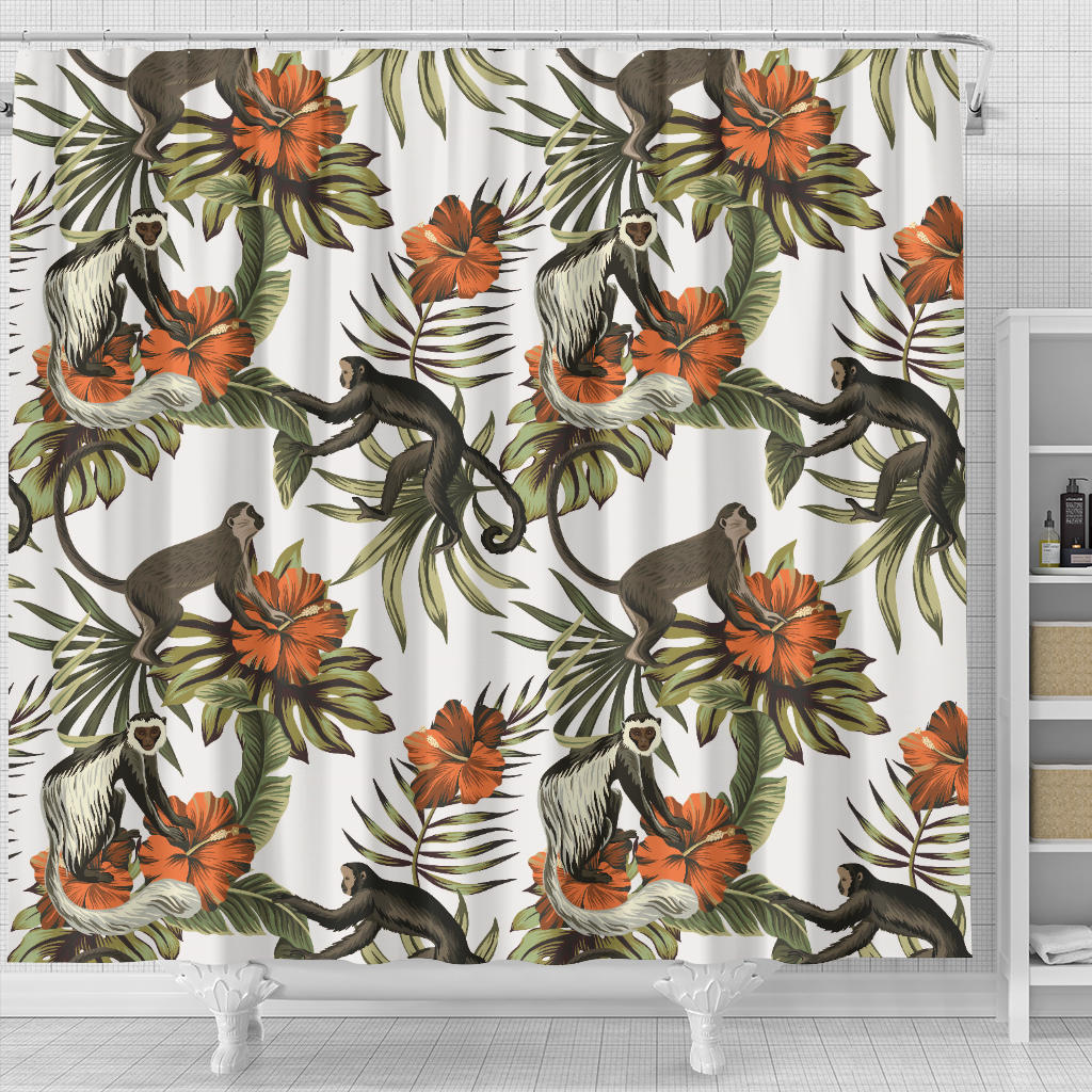 Monkey Red Hibiscus Flower Palm Leaves Floral Pattern Shower Curtain Fulfilled In US