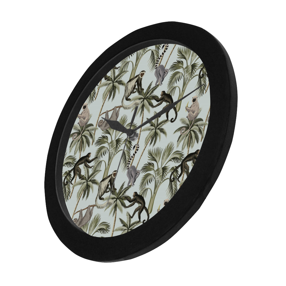 Monkey sloth lemur palm trees pattern Elegant Black Wall Clock