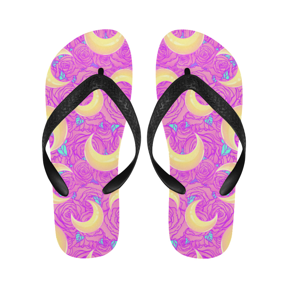 Moon pink rose background Unisex Flip Flops is a uniqued design and limited item. It made to order, hand printed, and sewn with love in our factory.