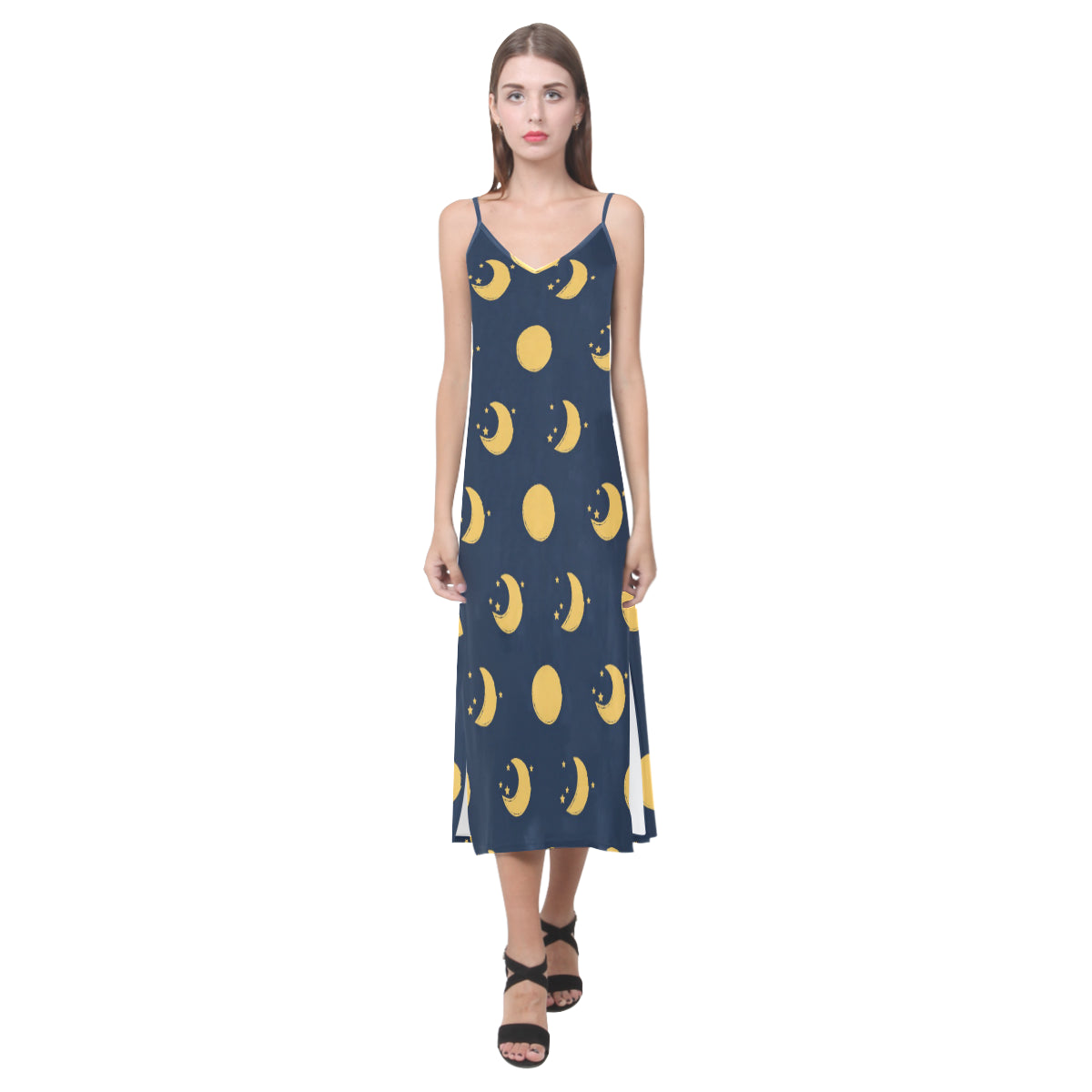 Moon star pattern V-Neck Open Fork Long Dress is a uniqued design and limited item. It made to order, hand printed, and sewn with love in our factory.