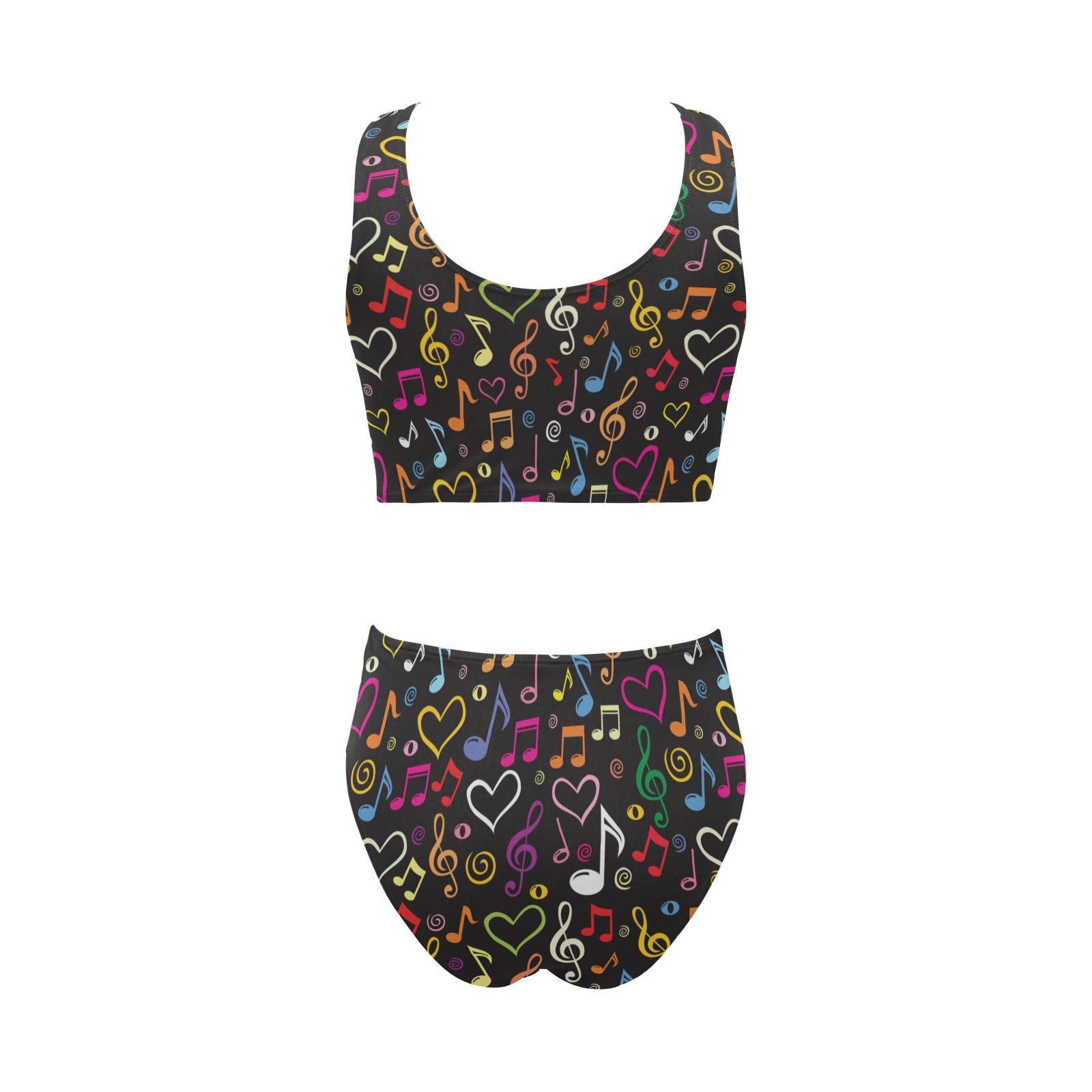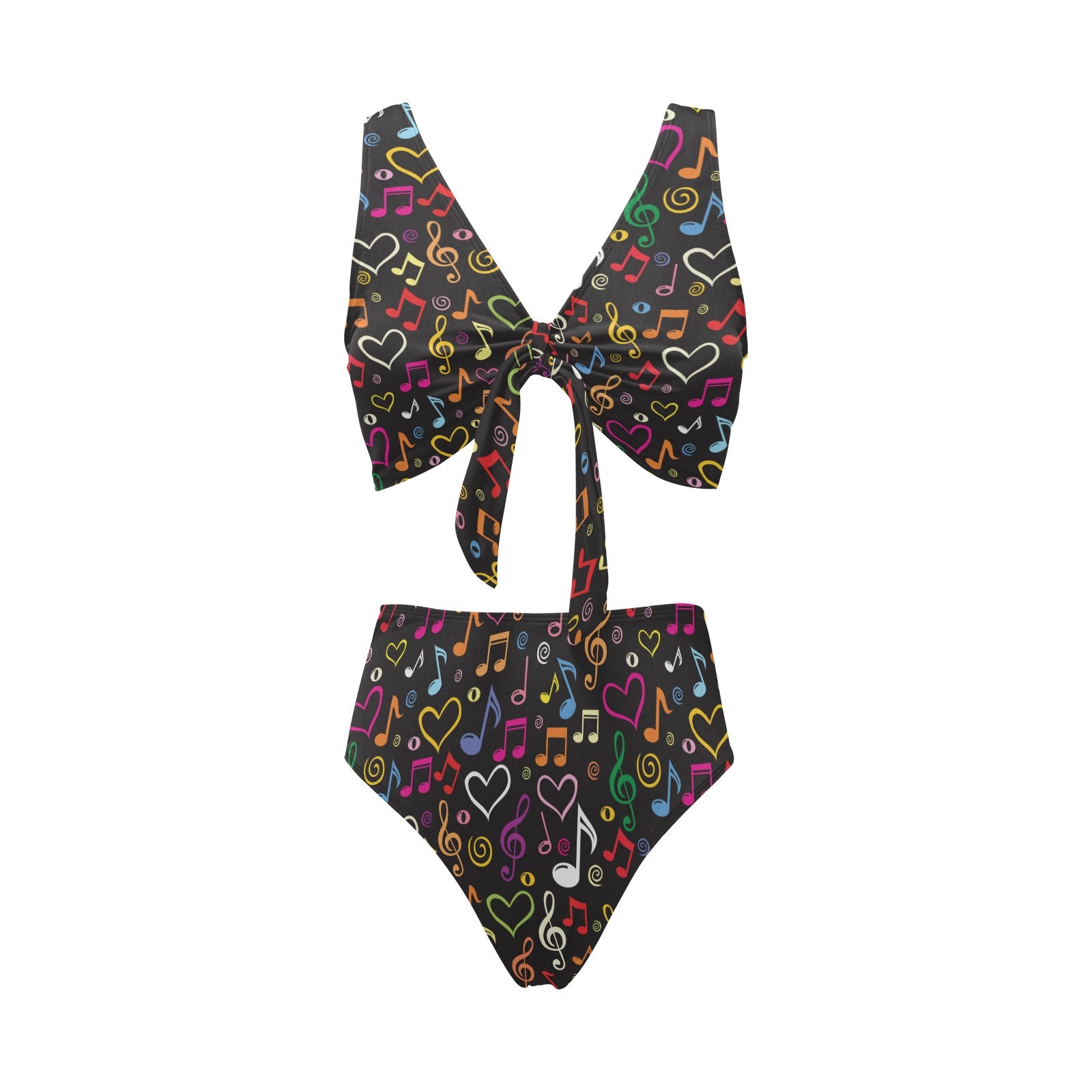 Music Notes Pattern Print Design 02 Chest Bowknot High Waisted Bikini Swimsuit