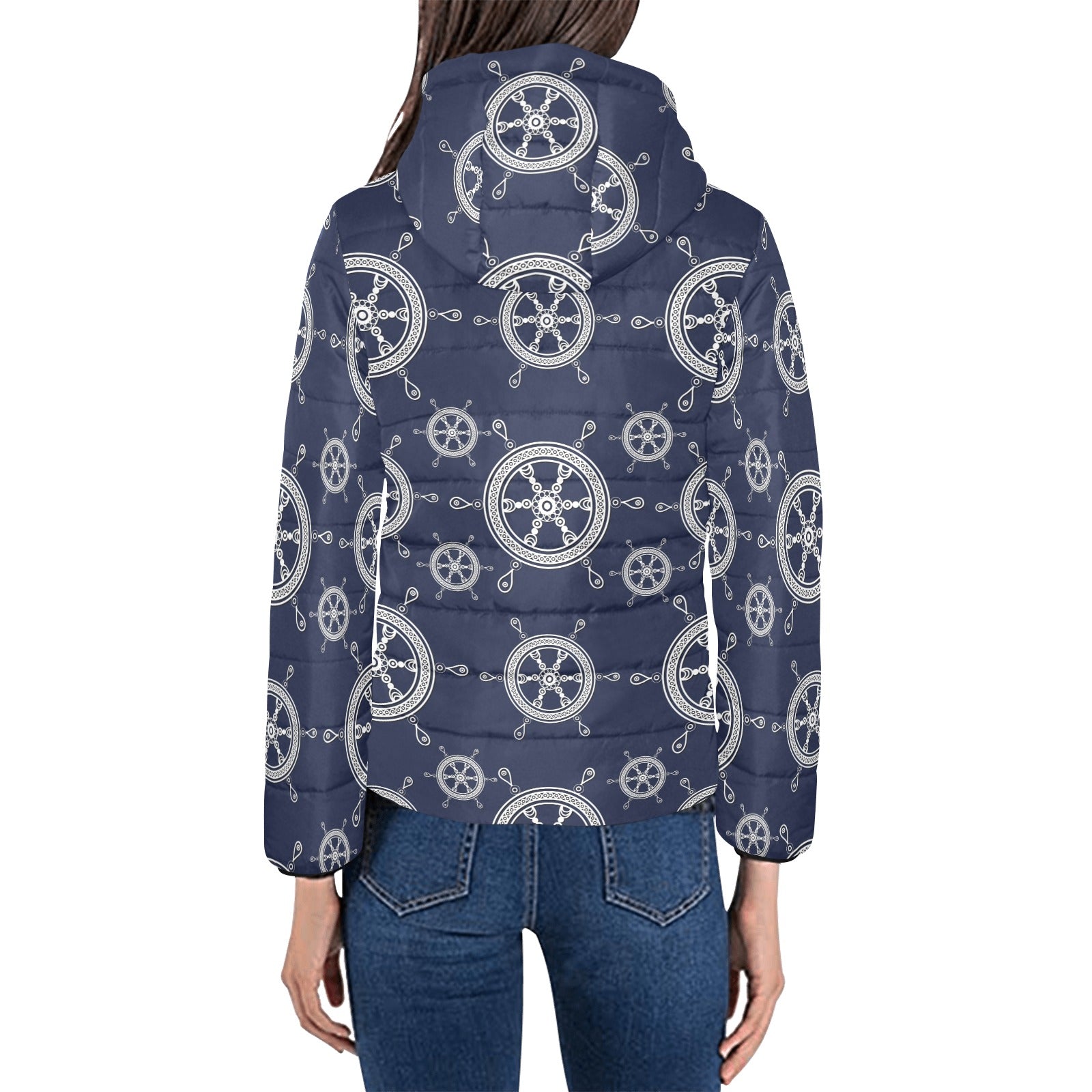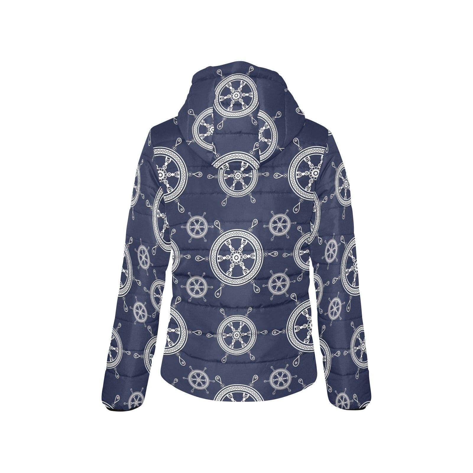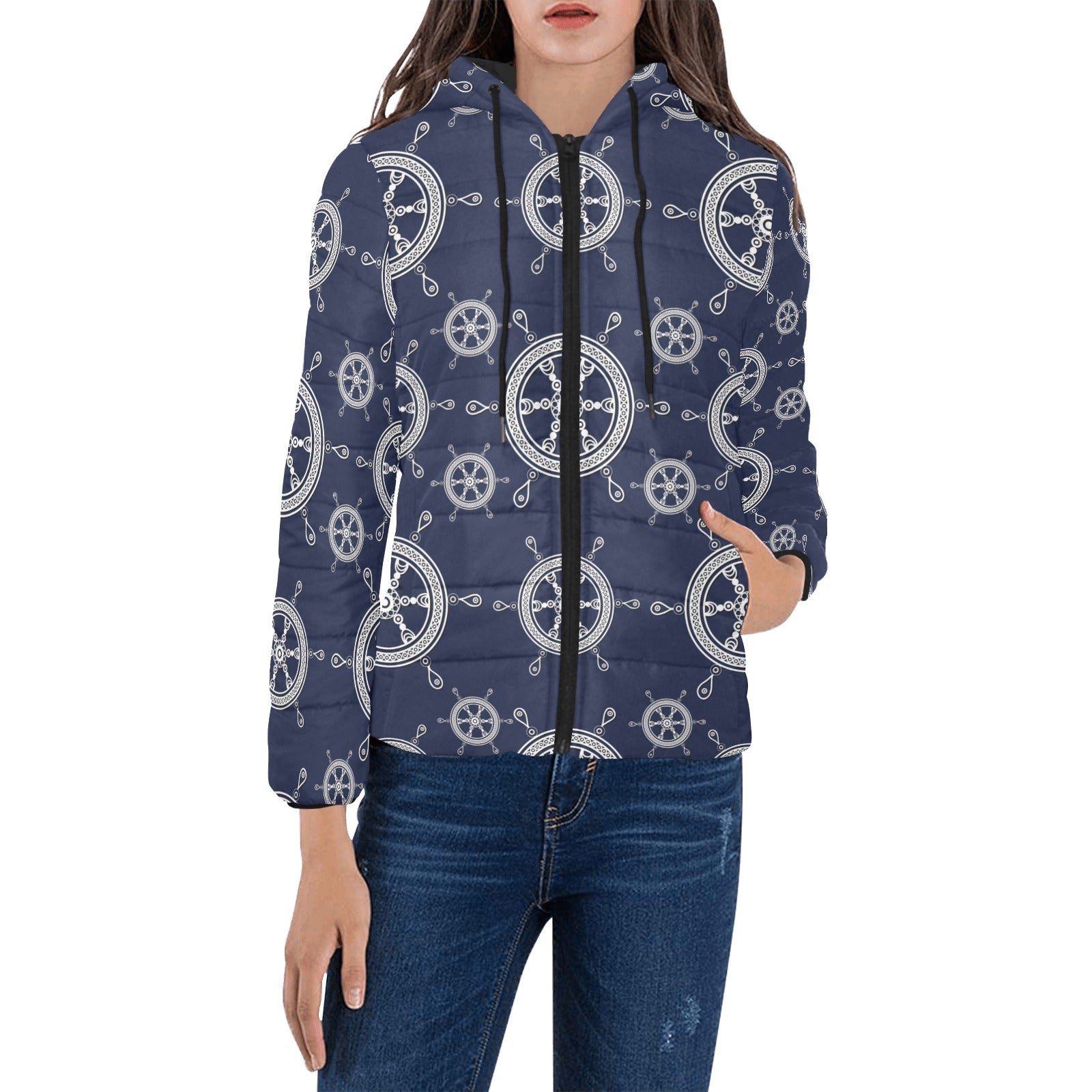nautical steering wheel design pattern Women's Padded Hooded Jacket