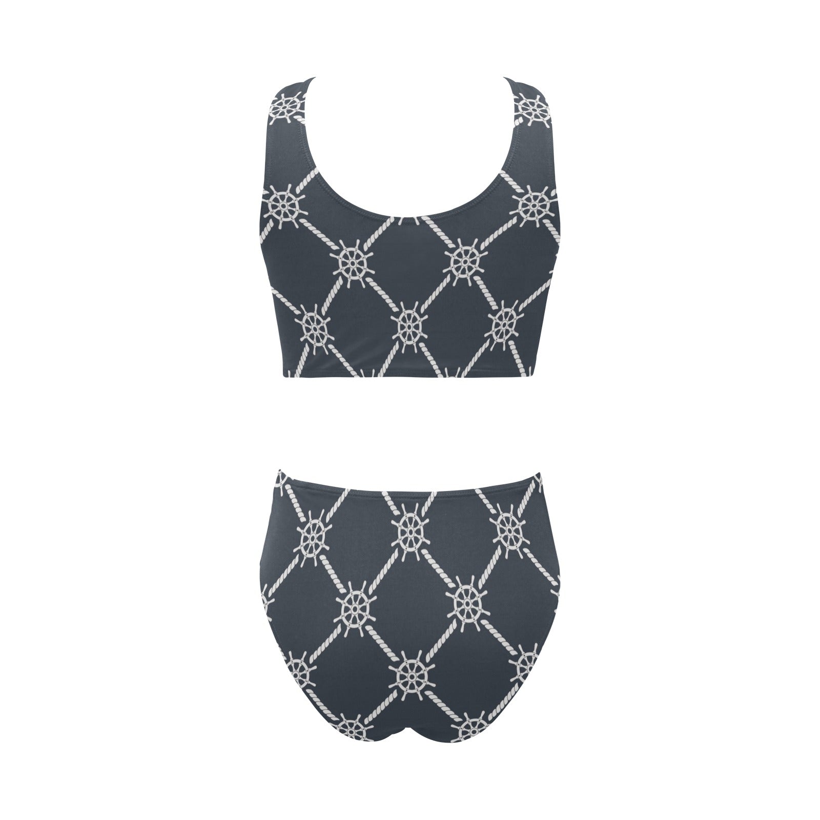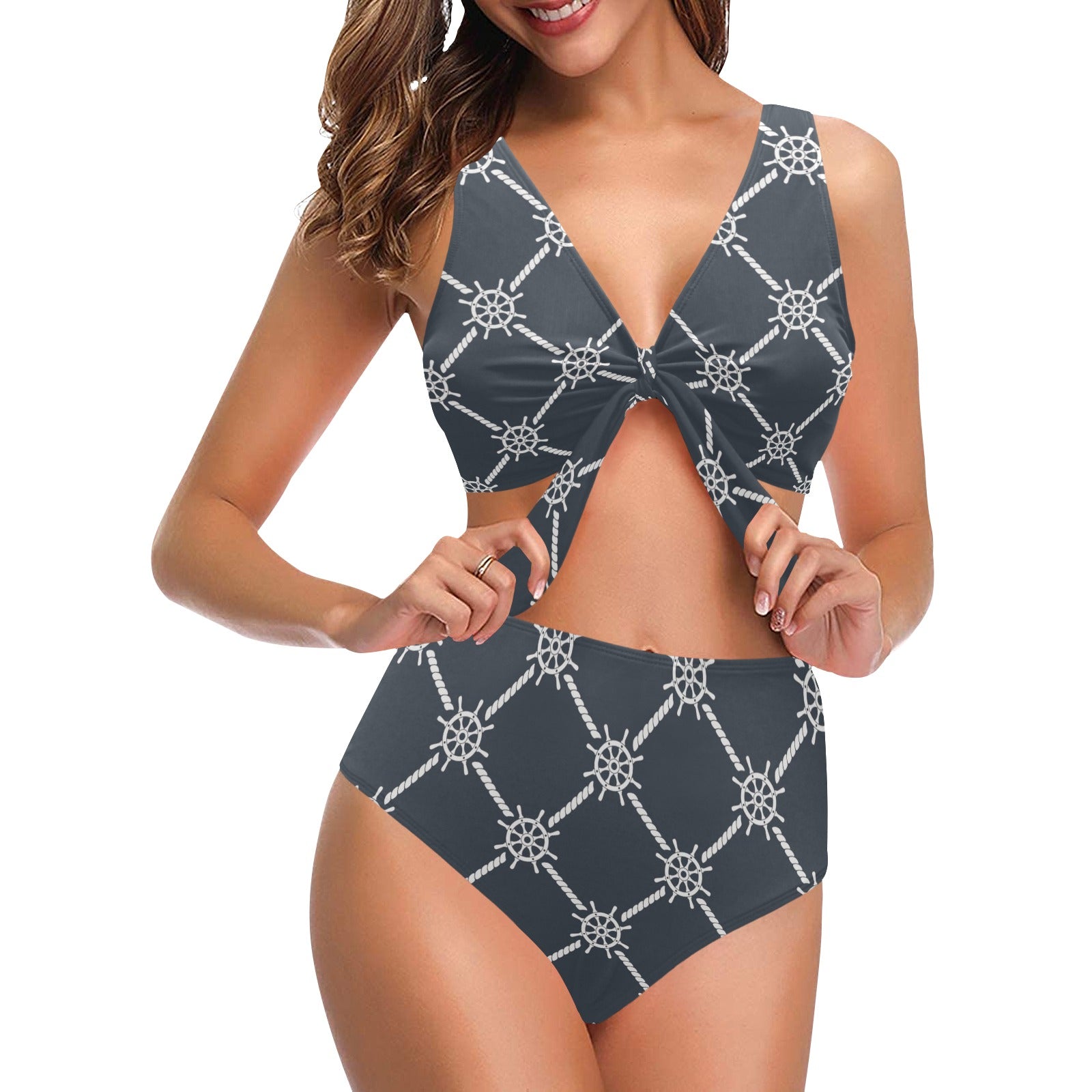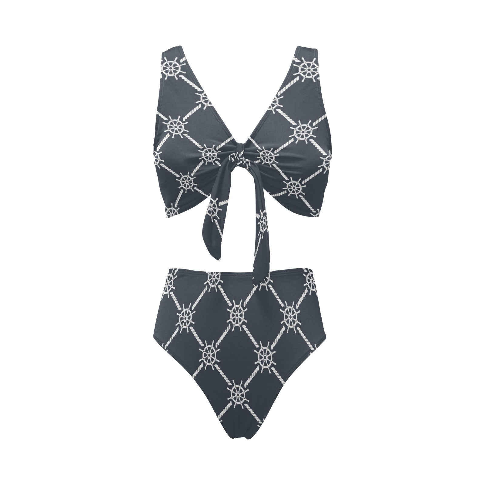 nautical steering wheel rope pattern Chest Bowknot High Waisted Bikini Swimsuit