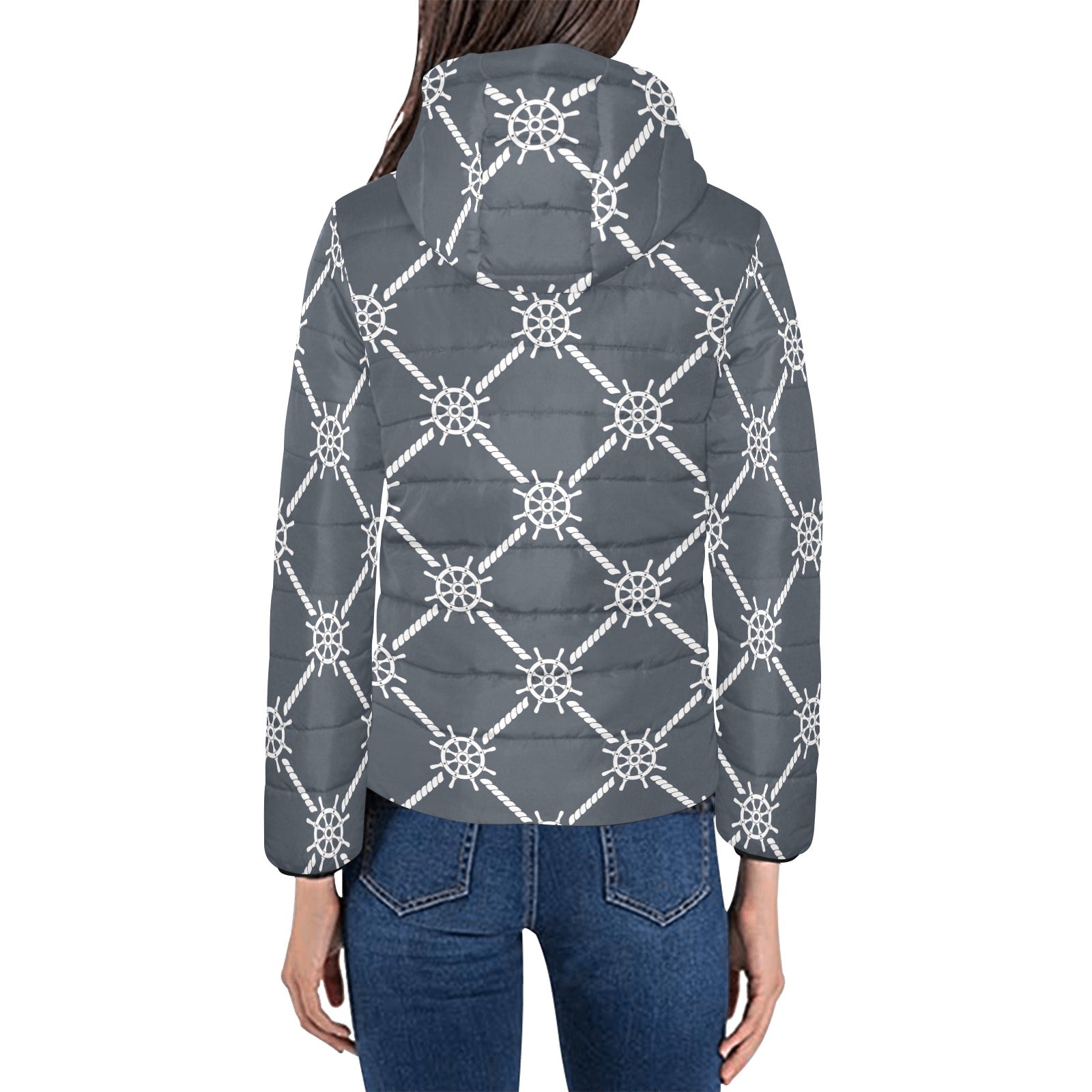 nautical steering wheel rope pattern Women's Padded Hooded Jacket