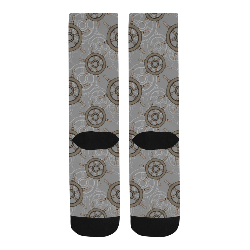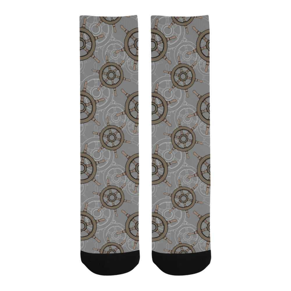 nautical wood steering wheel pattern Crew Socks are uniqued design and limited item. It made to order, hand printed, and sewn with love in our factory.