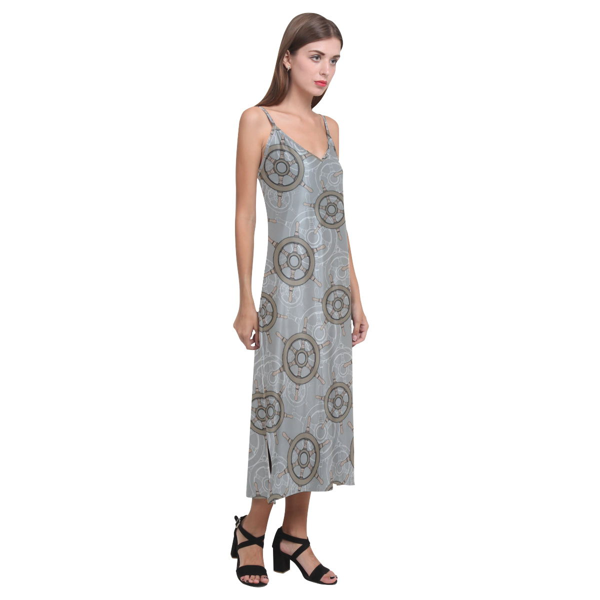 nautical wood steering wheel pattern V-Neck Open Fork Long Dress