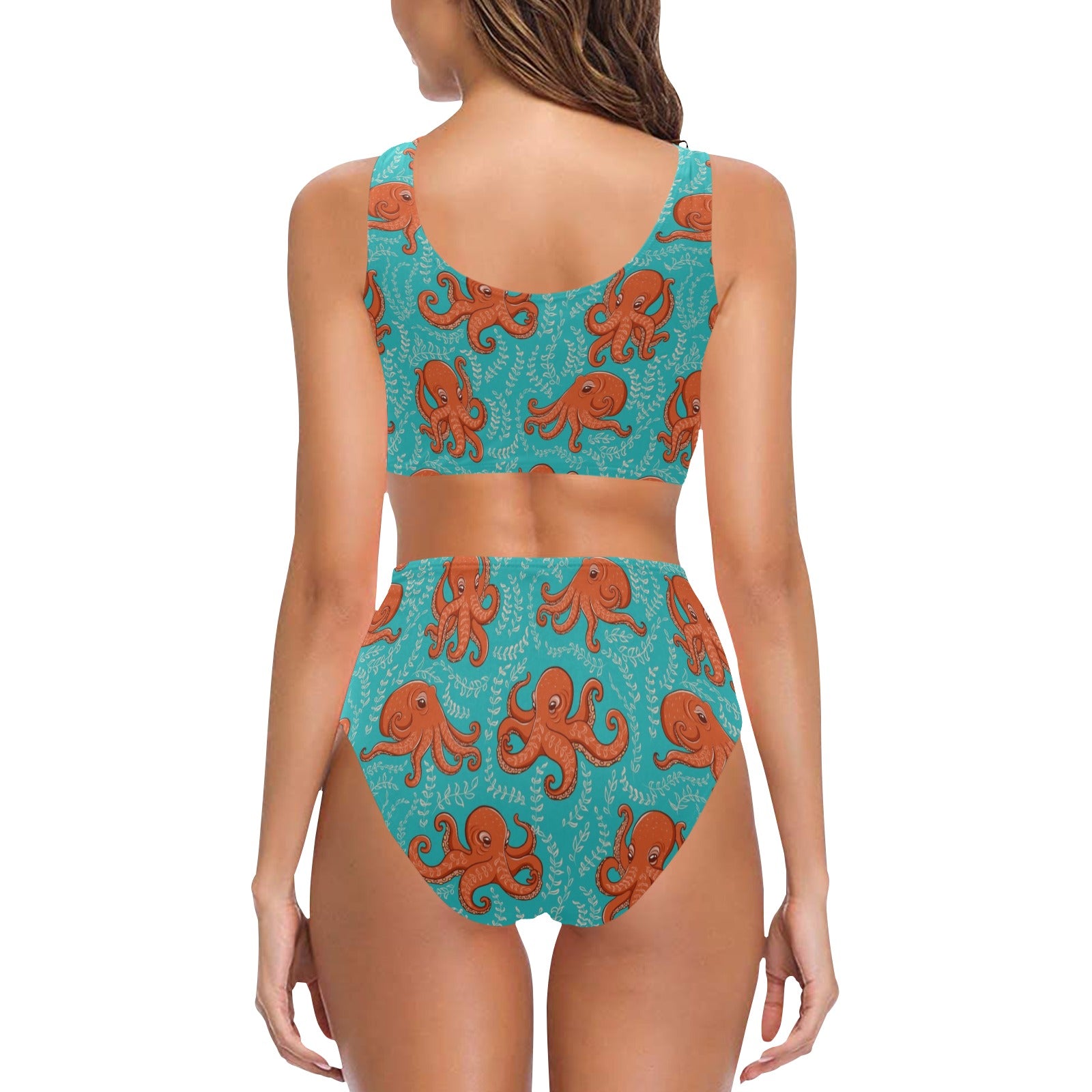 Octopus turquoise background Chest Bowknot High Waisted Bikini Swimsuit
