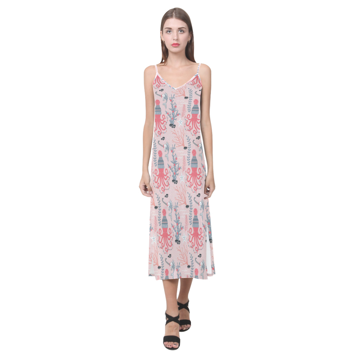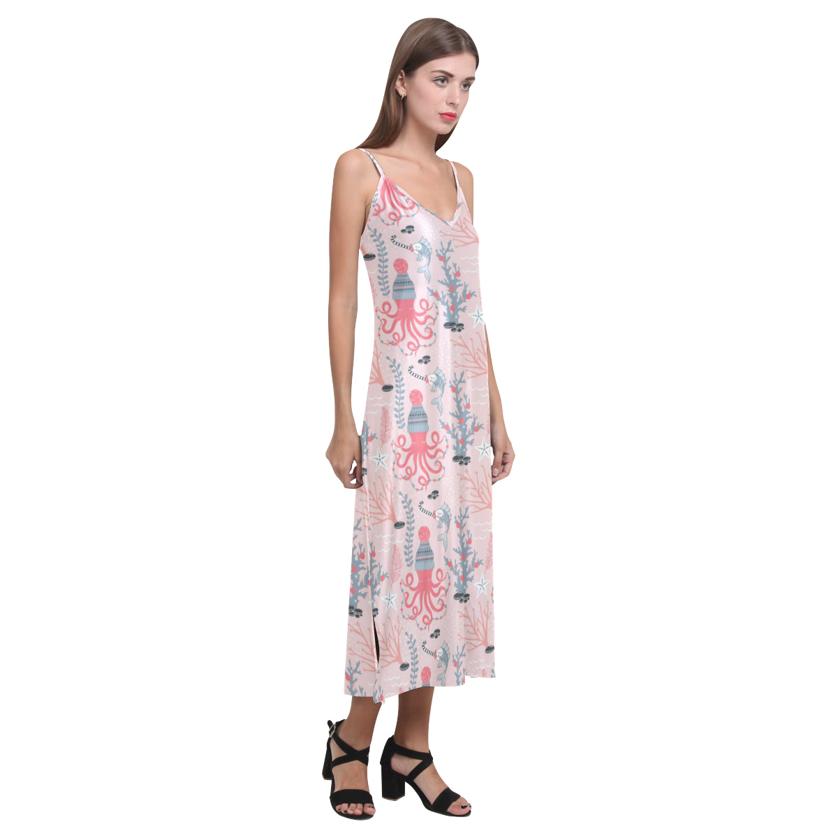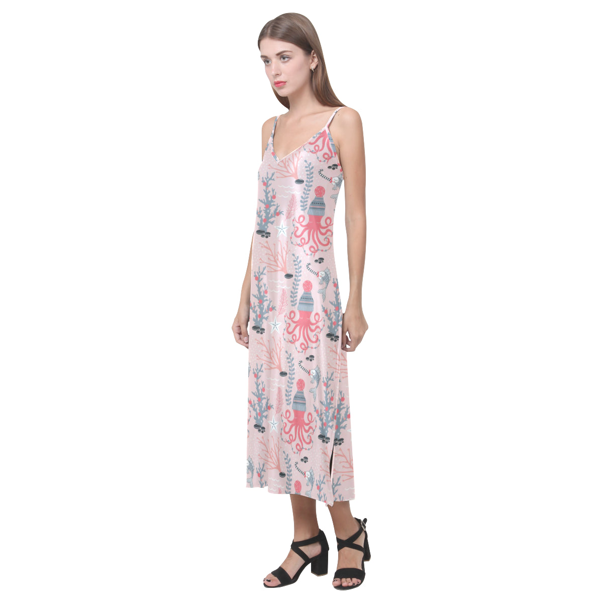 Octopus winter hat garland Fish candy Seaweed Cora V-Neck Open Fork Long Dress is a uniqued design and limited item. It made to order, hand printed, and sewn with love in our factory.