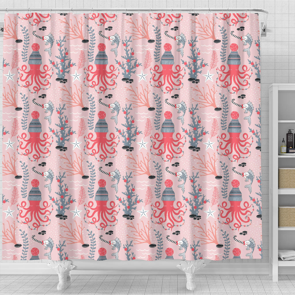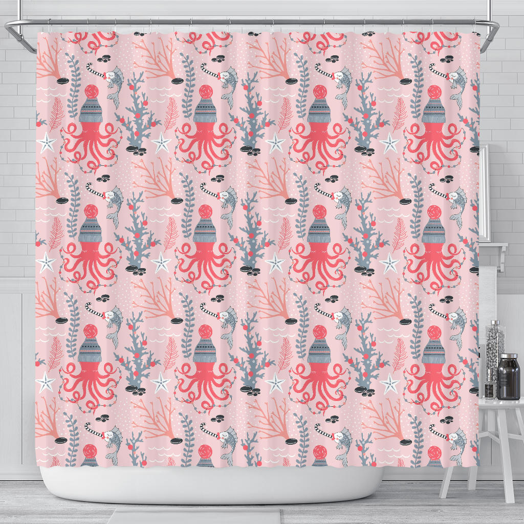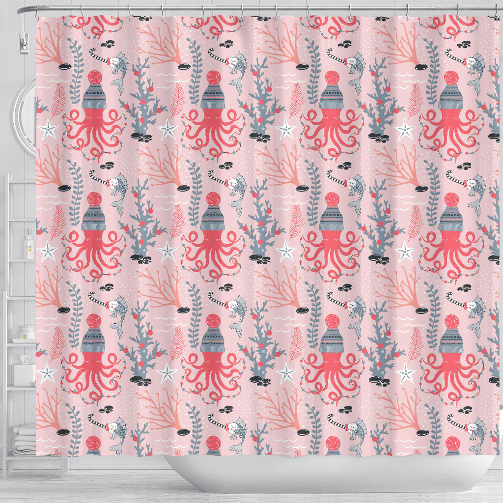 Octopus winter hat garland Fish candy Seaweed Coral Starfish Shower Curtain is a uniqued design and limited item. It made to order, hand printed, and sewn with love in our factory.