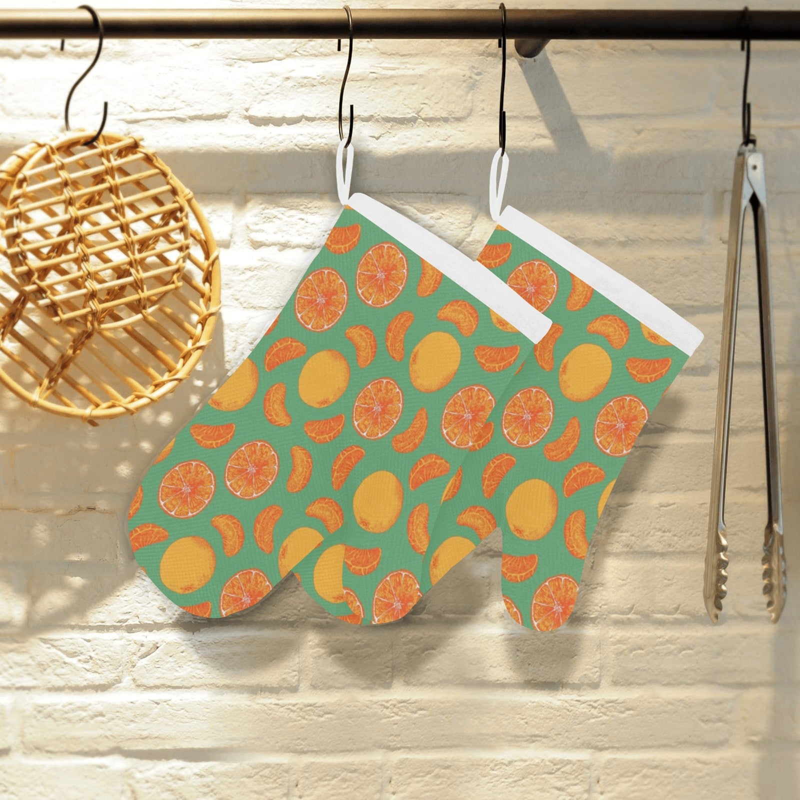 orange fruit pattern green background Heat Resistant Oven Mitts