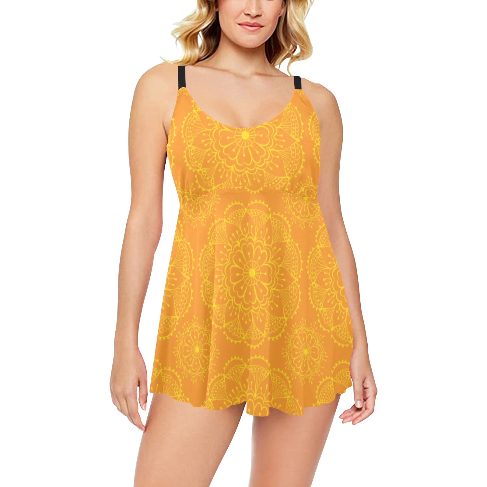 Orange traditional indian element pattern Chest Sexy Pleated Two Piece Swim Dress