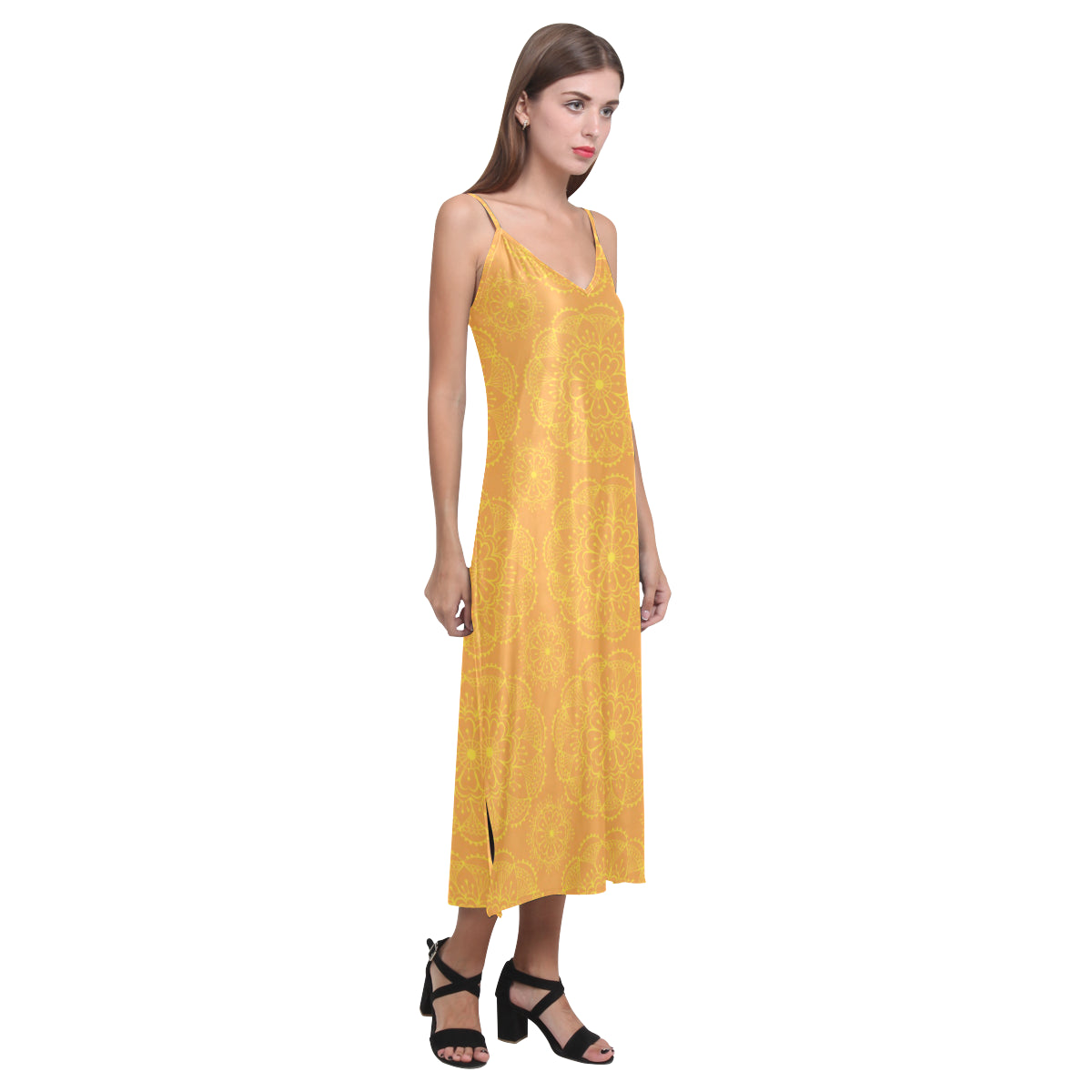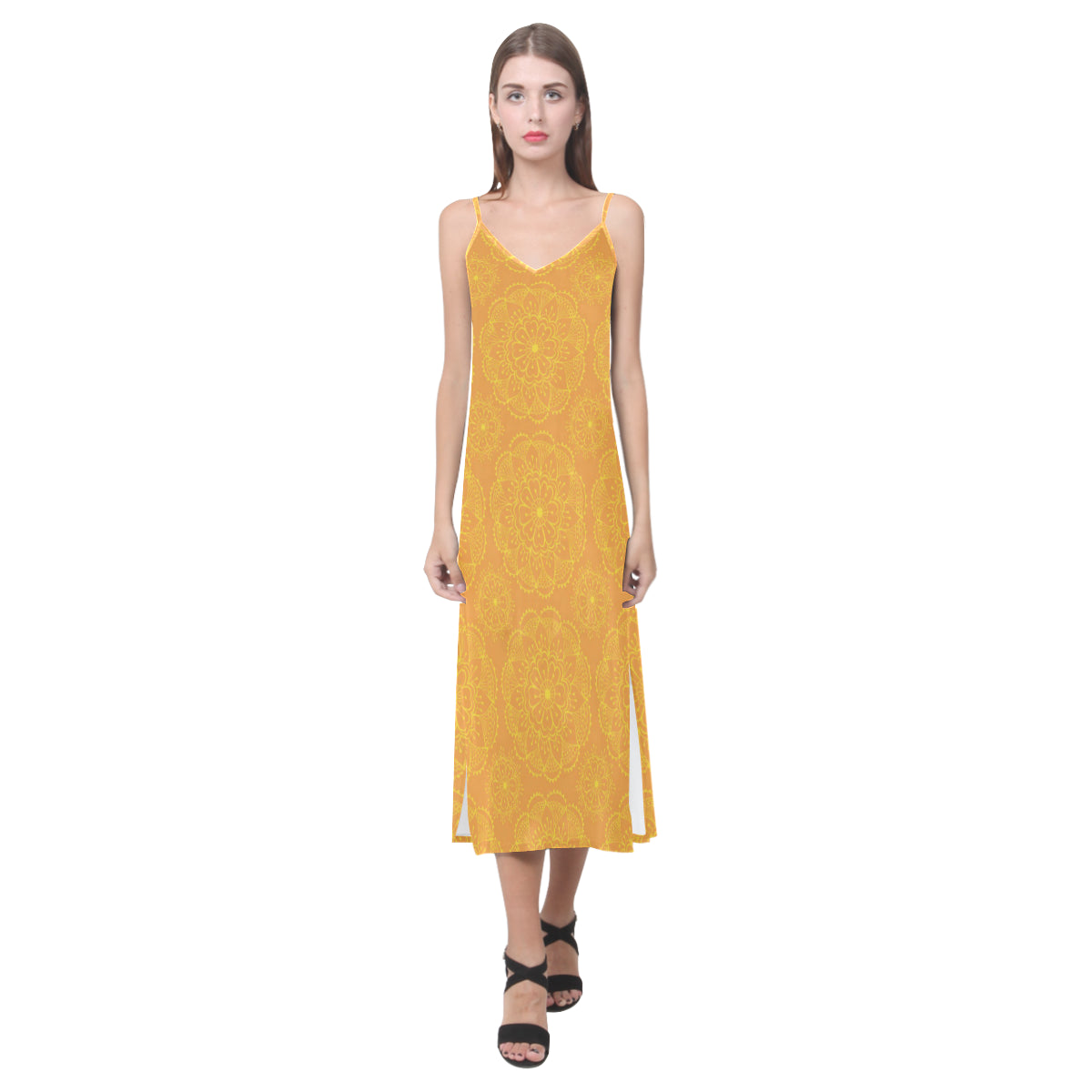 Orange traditional indian element pattern V-Neck Open Fork Long Dress is a uniqued design and limited item. It made to order, hand printed, and sewn with love in our factory.