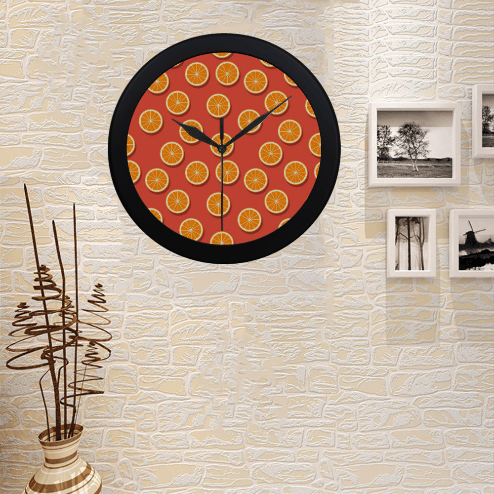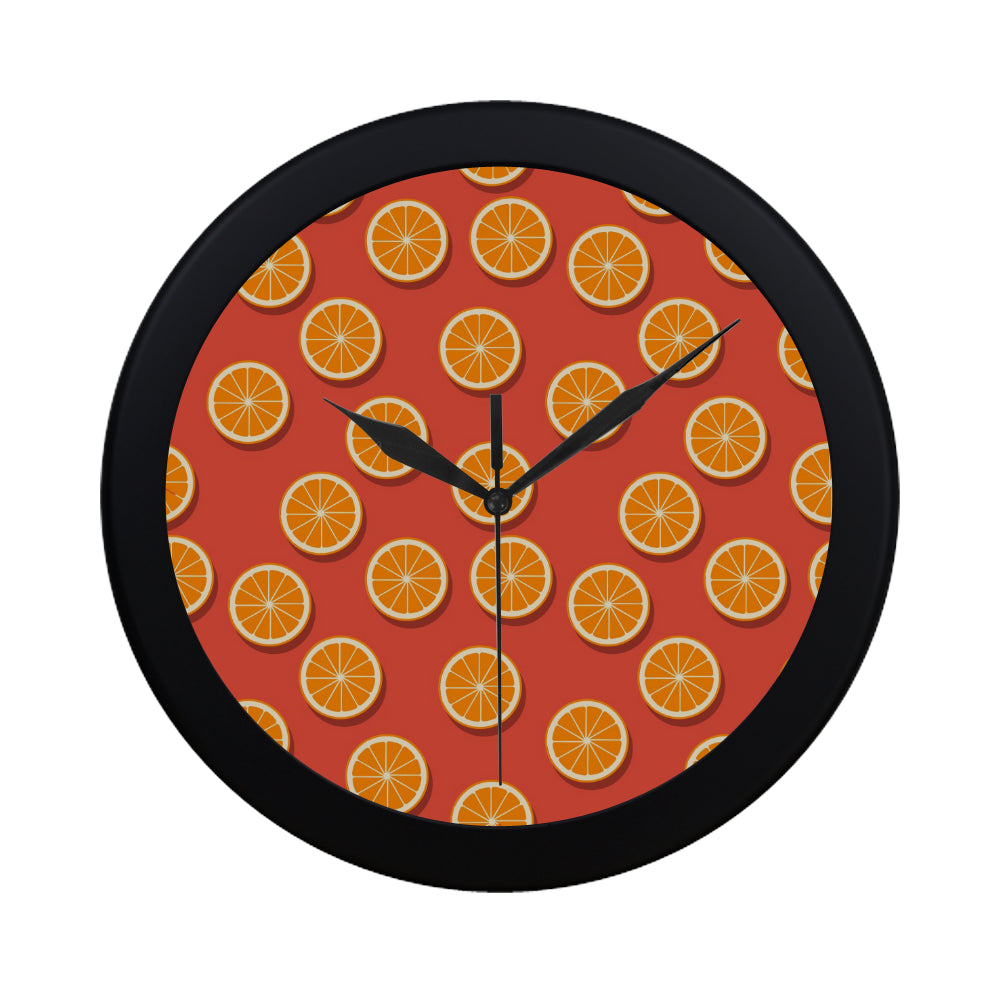 Oranges pattern red background Elegant Black Wall Clock is a uniqued design and limited item. It made to order, hand printed, and sewn with love in our factory.