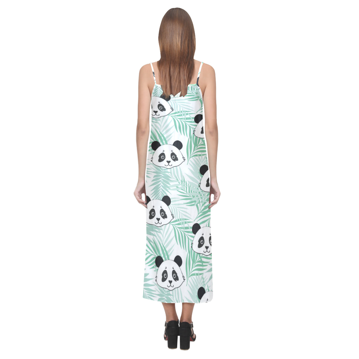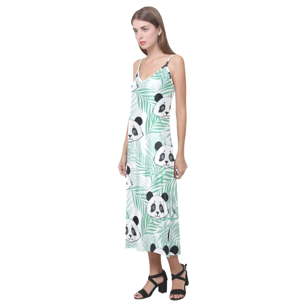 Panda pattern tropical leaves background V-Neck Open Fork Long Dress is a uniqued design and limited item. It made to order, hand printed, and sewn with love in our factory.