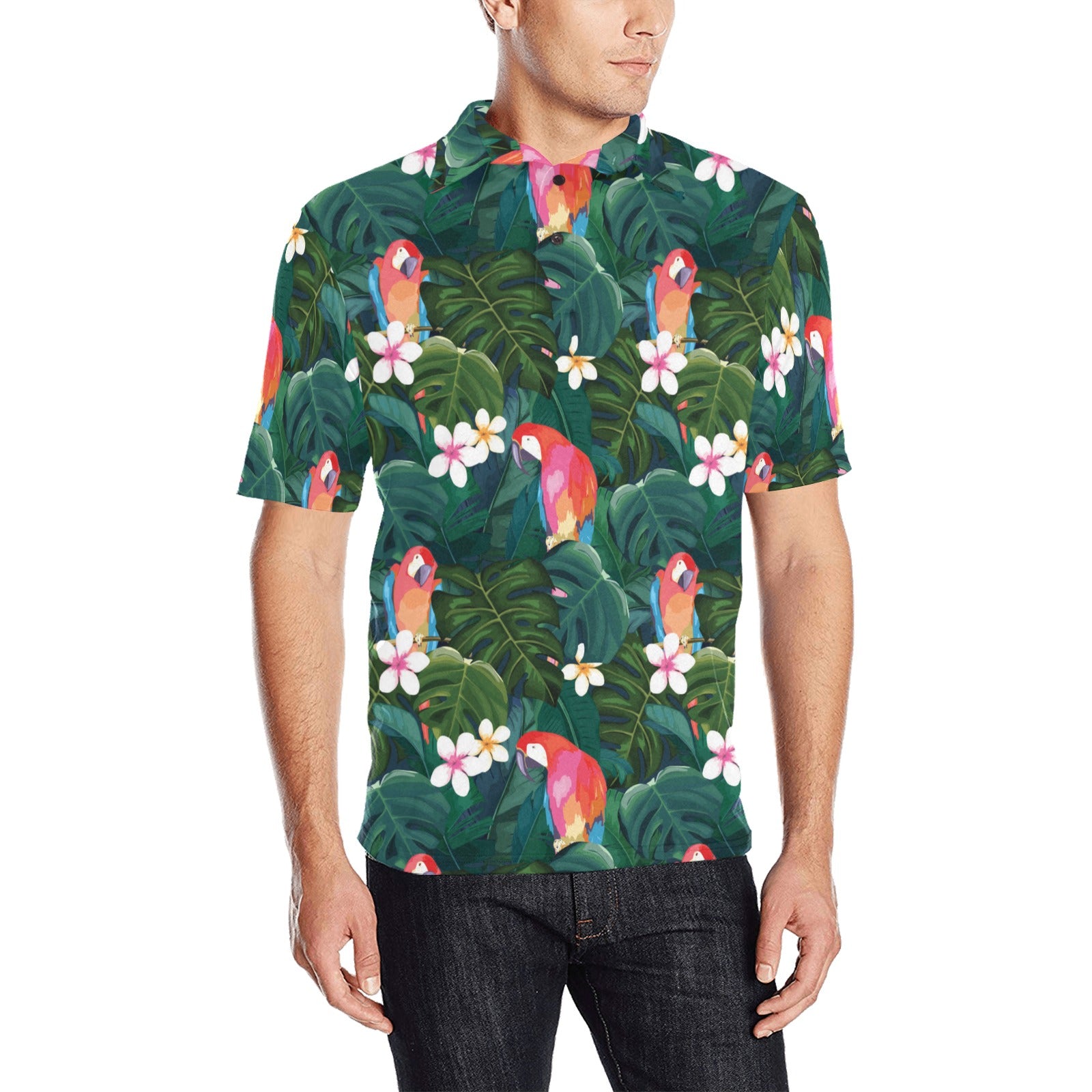 Parrot Palm tree leaves flower hibiscus pattern Men's All Over Print Polo Shirt