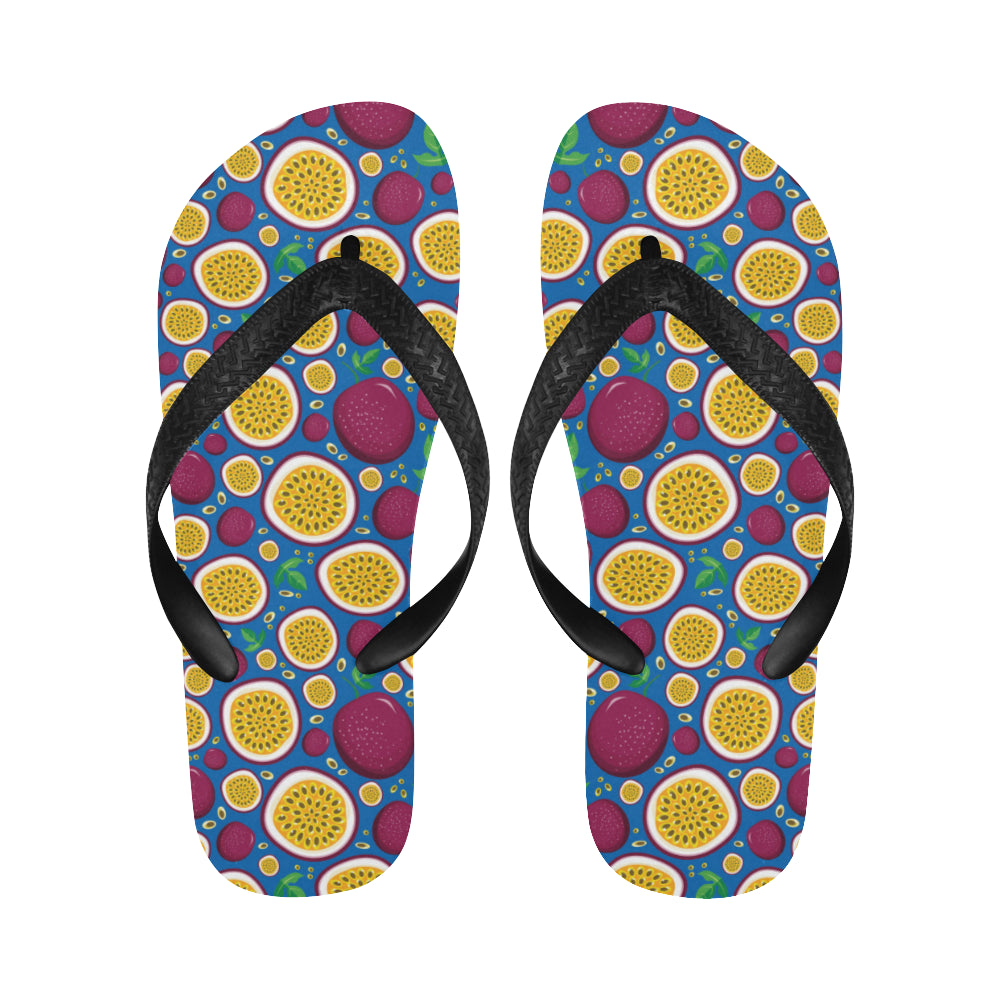 Passion fruit blue background Unisex Flip Flops is a uniqued design and limited item. It made to order, hand printed, and sewn with love in our factory.