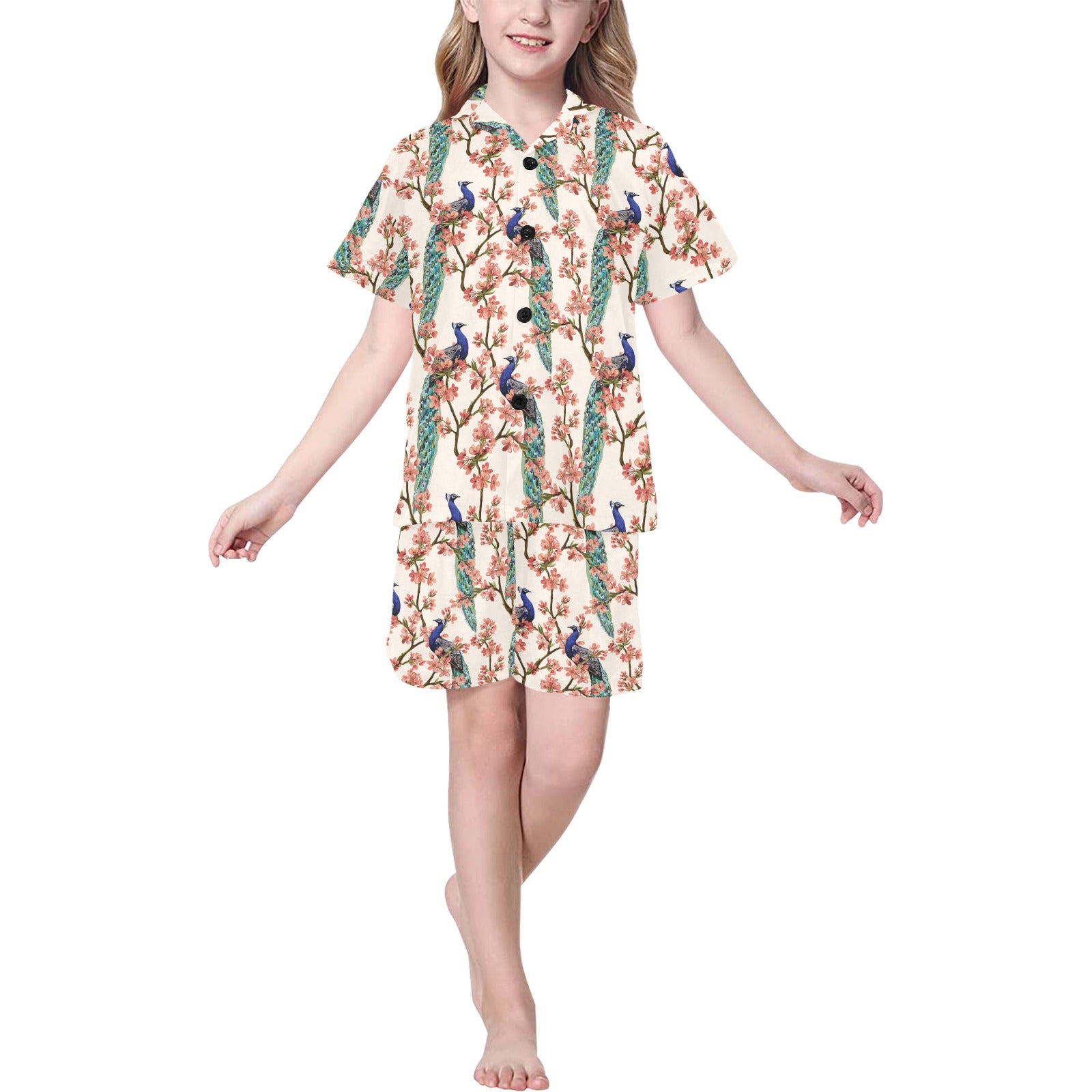 Peacock tropical flower pattern Kids' Boys' Girls' V-Neck Short Pajama Set