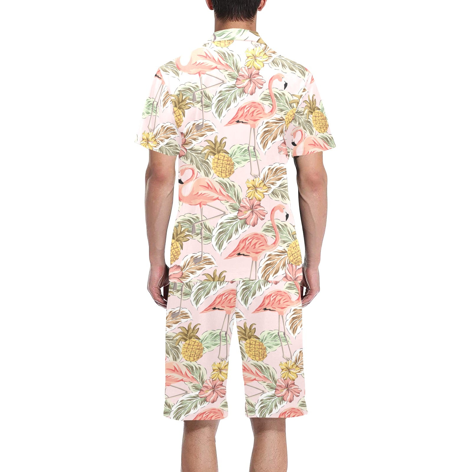 Pink flamingo birds pineapples hibiscus flower pat Men's V-Neck Short Pajama Set