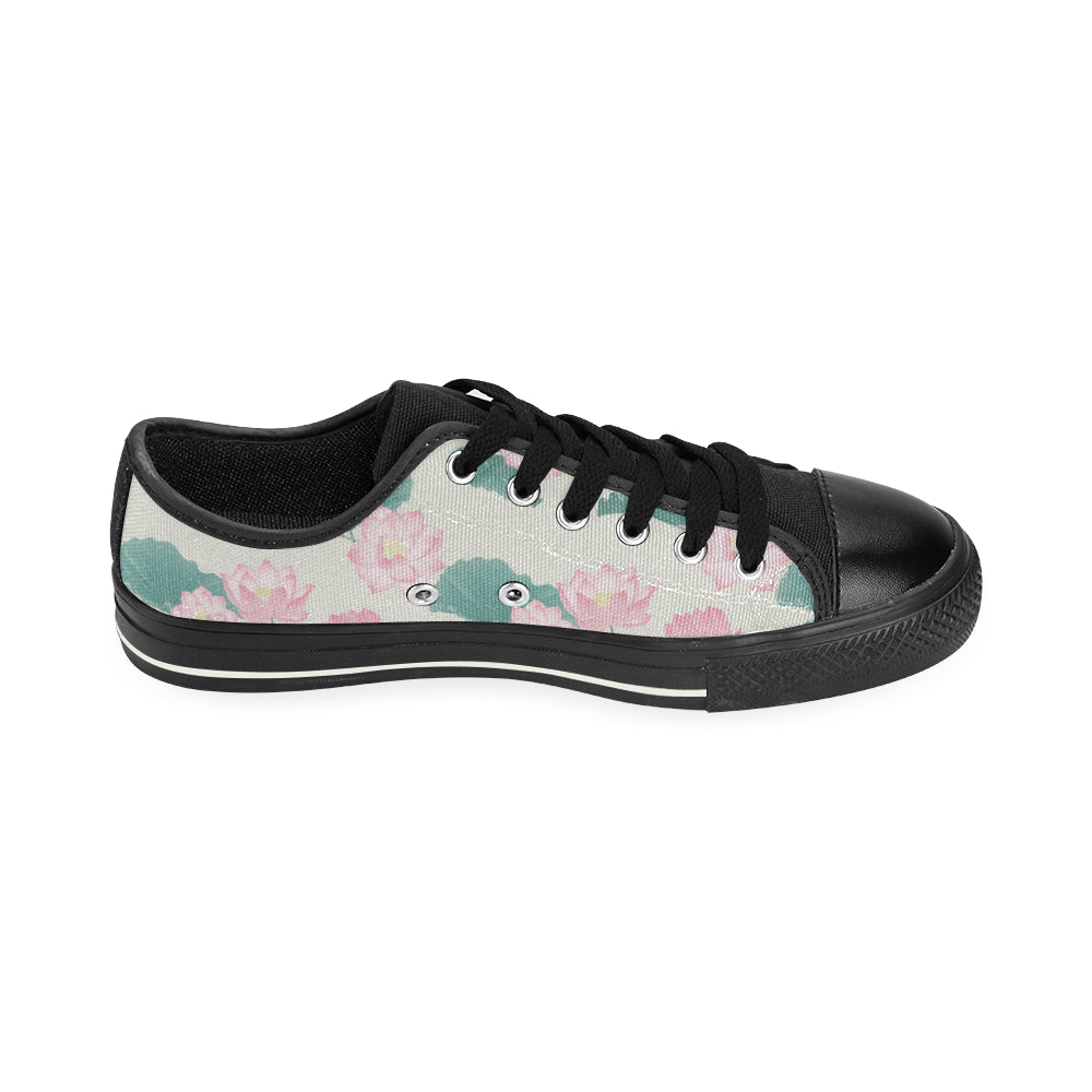 Pink lotus waterlily leaves pattern Men's Low Top Canvas Shoes Black
