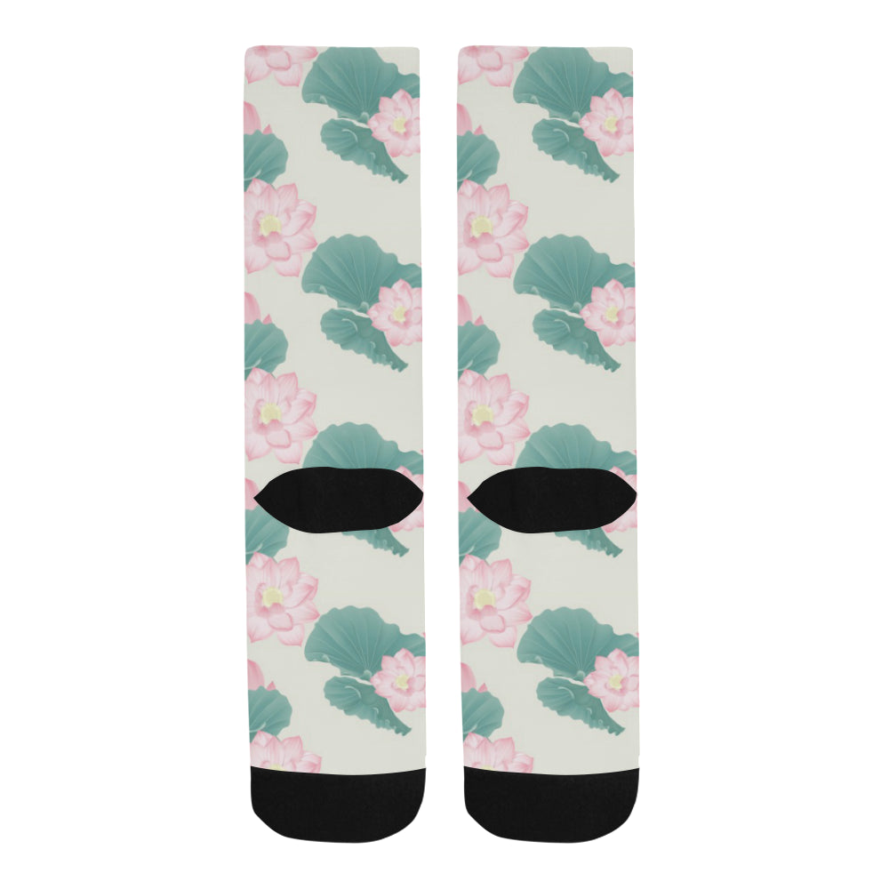 Pink lotus waterlily leaves pattern Crew Socks are uniqued design and limited item. It made to order, hand printed, and sewn with love in our factory.