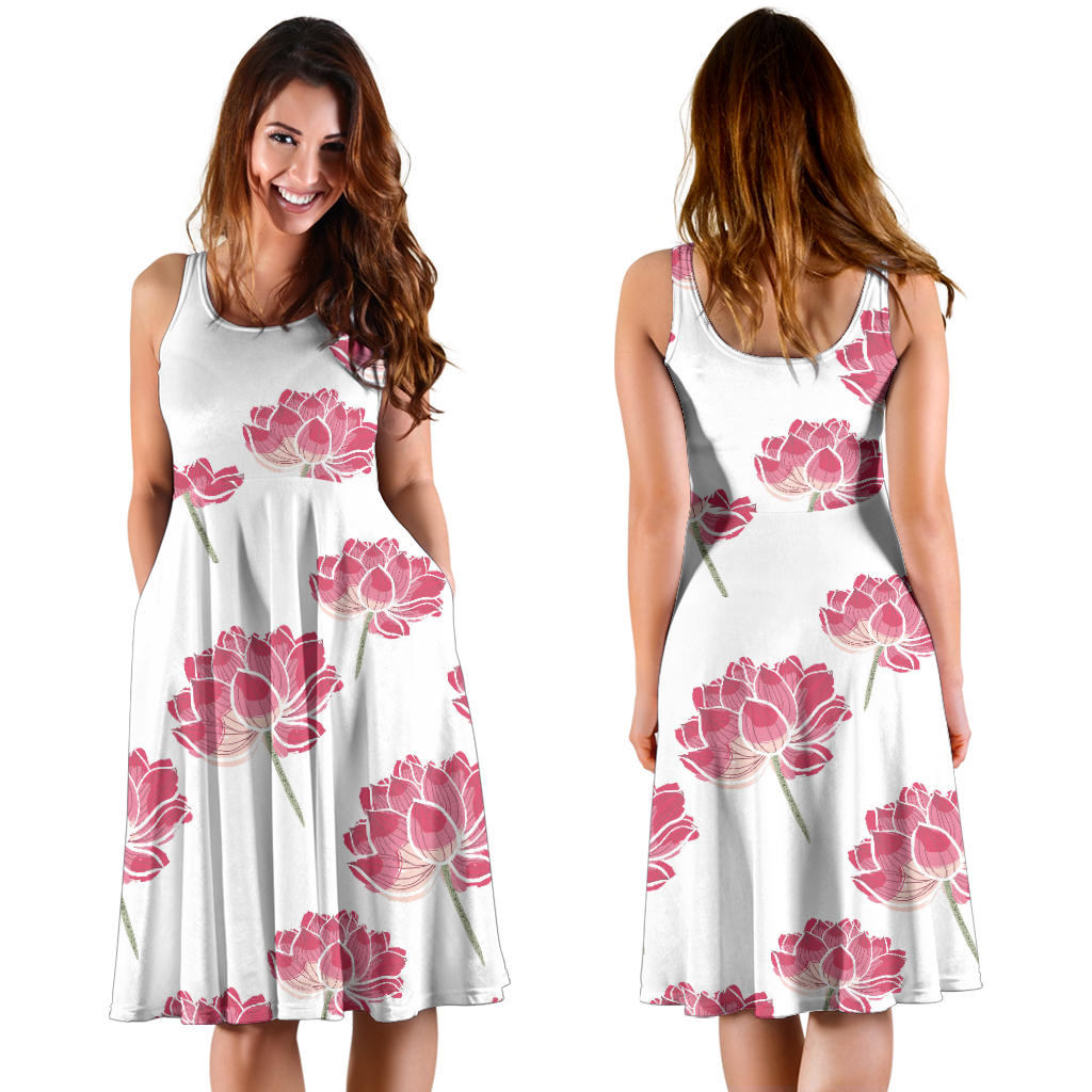 Pink Lotus Waterlily Pattern Sleeveless Midi Dress