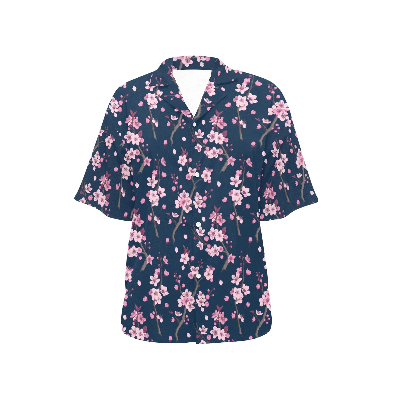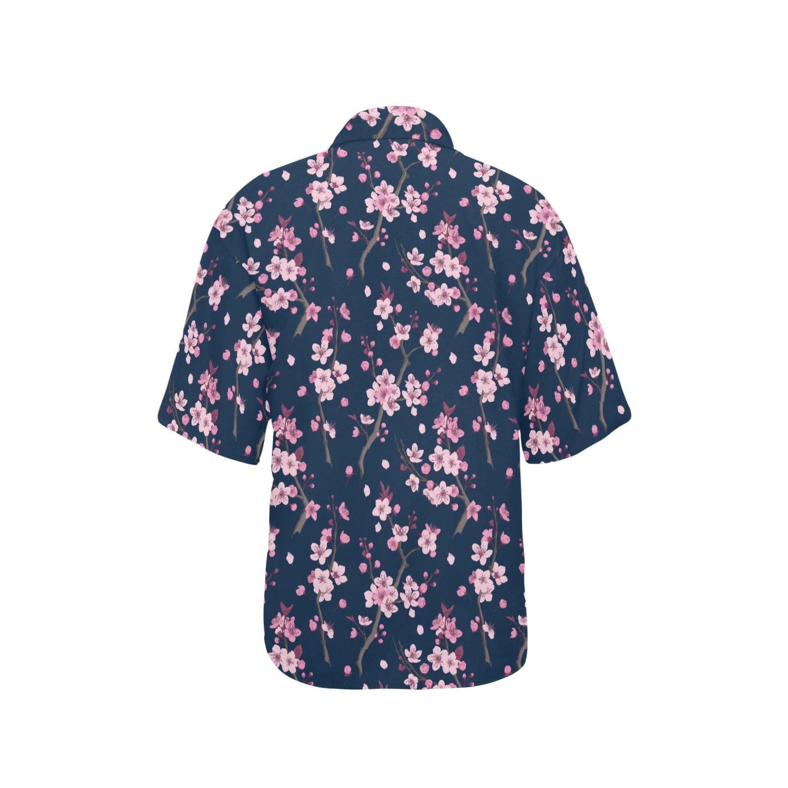 Pink sakura cherry blossom blue background Women's All Over Print Hawaiian Shirt