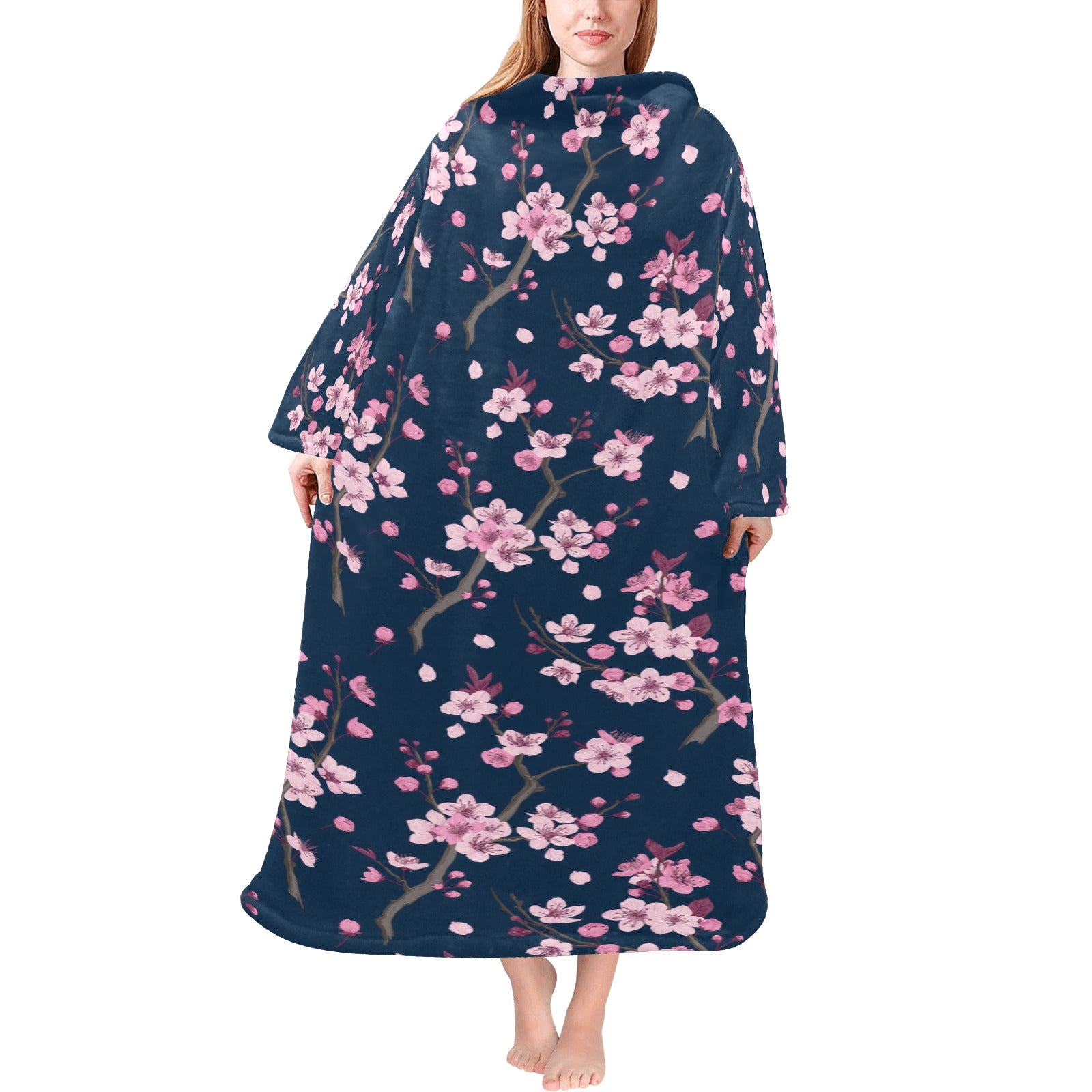 Pink sakura cherry blossom blue background Blanket Robe with Sleeves