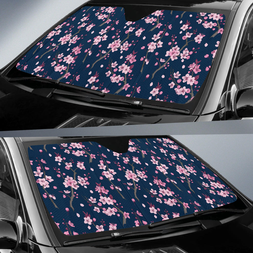 Pink sakura cherry blossom blue background Car Sun Shade is a uniqued design and limited item. It made to order, hand printed, and sewn with love in our factory.