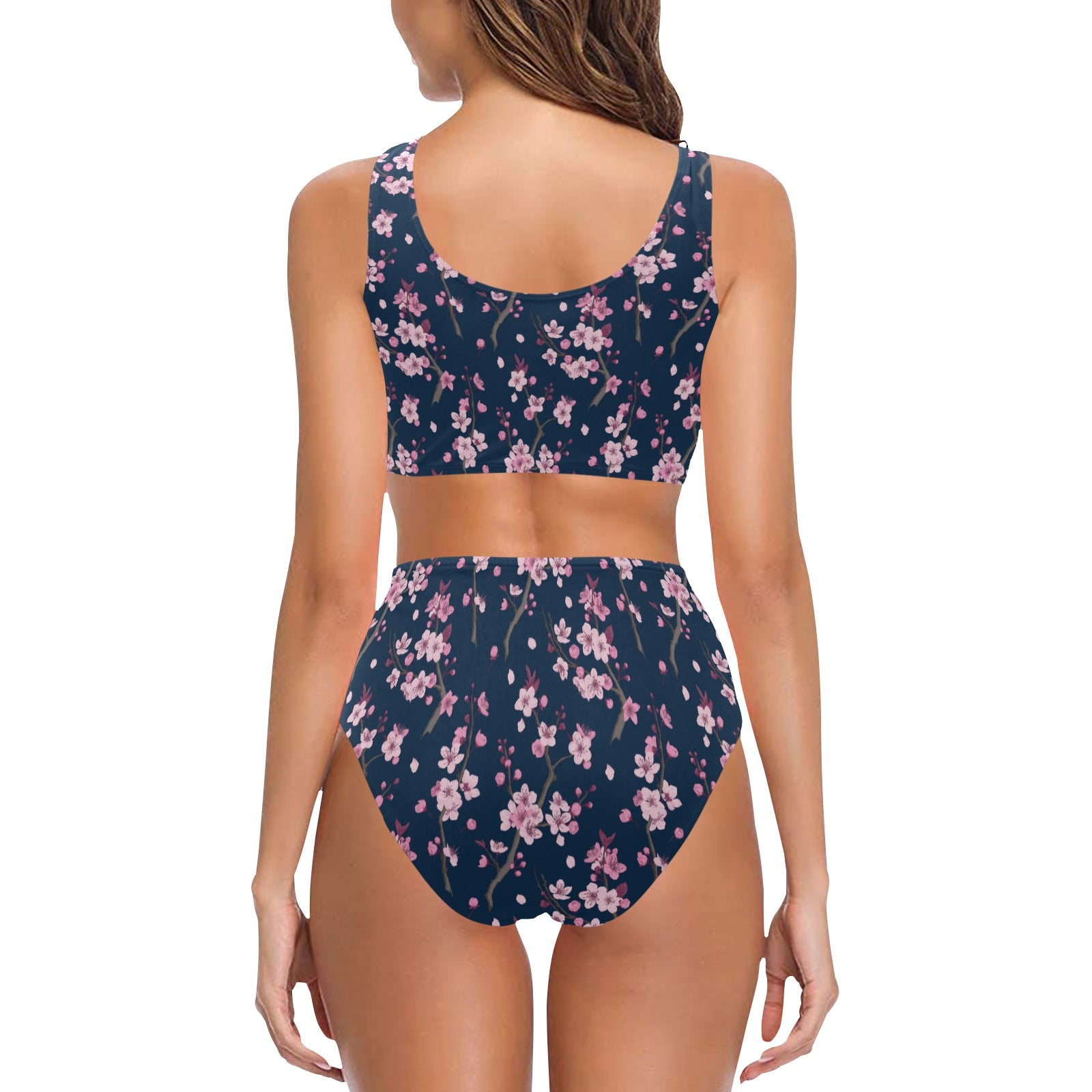Pink sakura cherry blossom blue background Chest Bowknot High Waisted Bikini Swimsuit