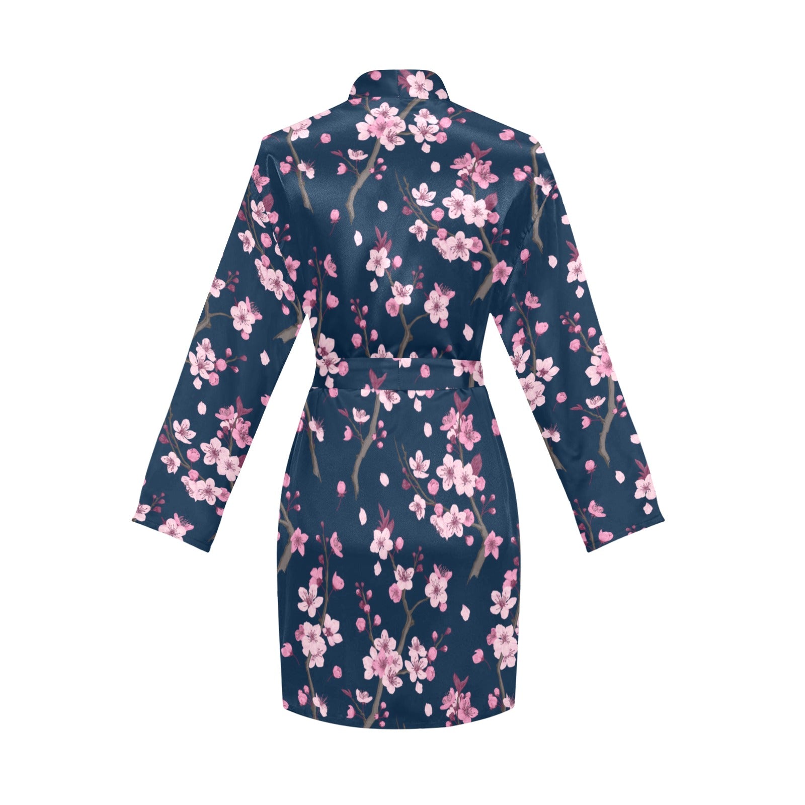 Pink sakura cherry blossom blue background Women's Long Sleeve Belted Night Robe