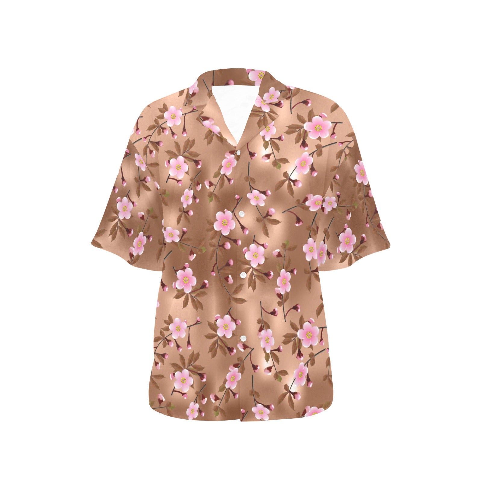 Pink sakura cherry blossom drak brown background Women's All Over Print Hawaiian Shirt