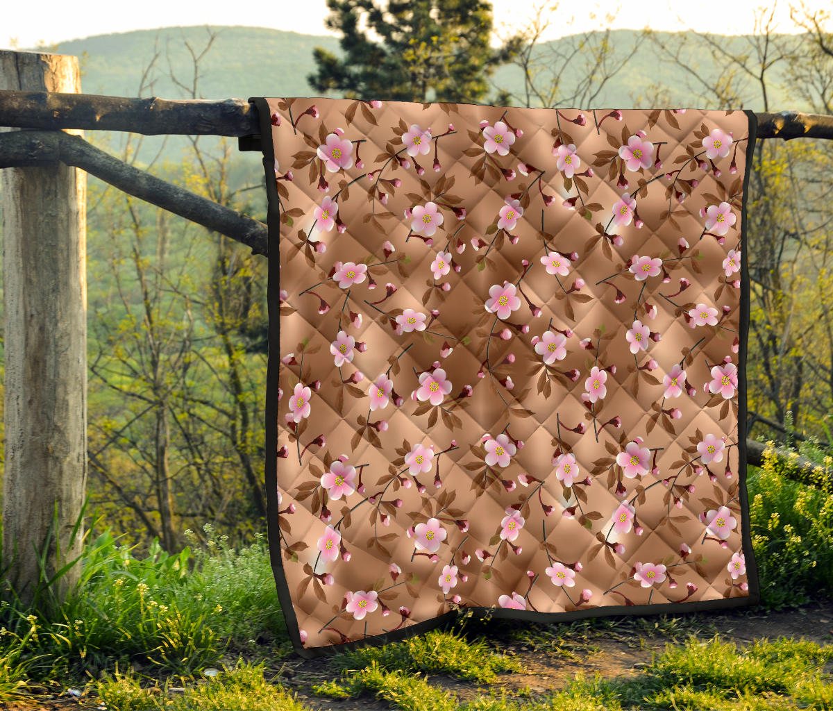 Pink Sakura Cherry Blossom Drak Brown Background Premium Quilt is a uniqued design and limited item. It made to order, hand printed, and sewn with love in our factory.