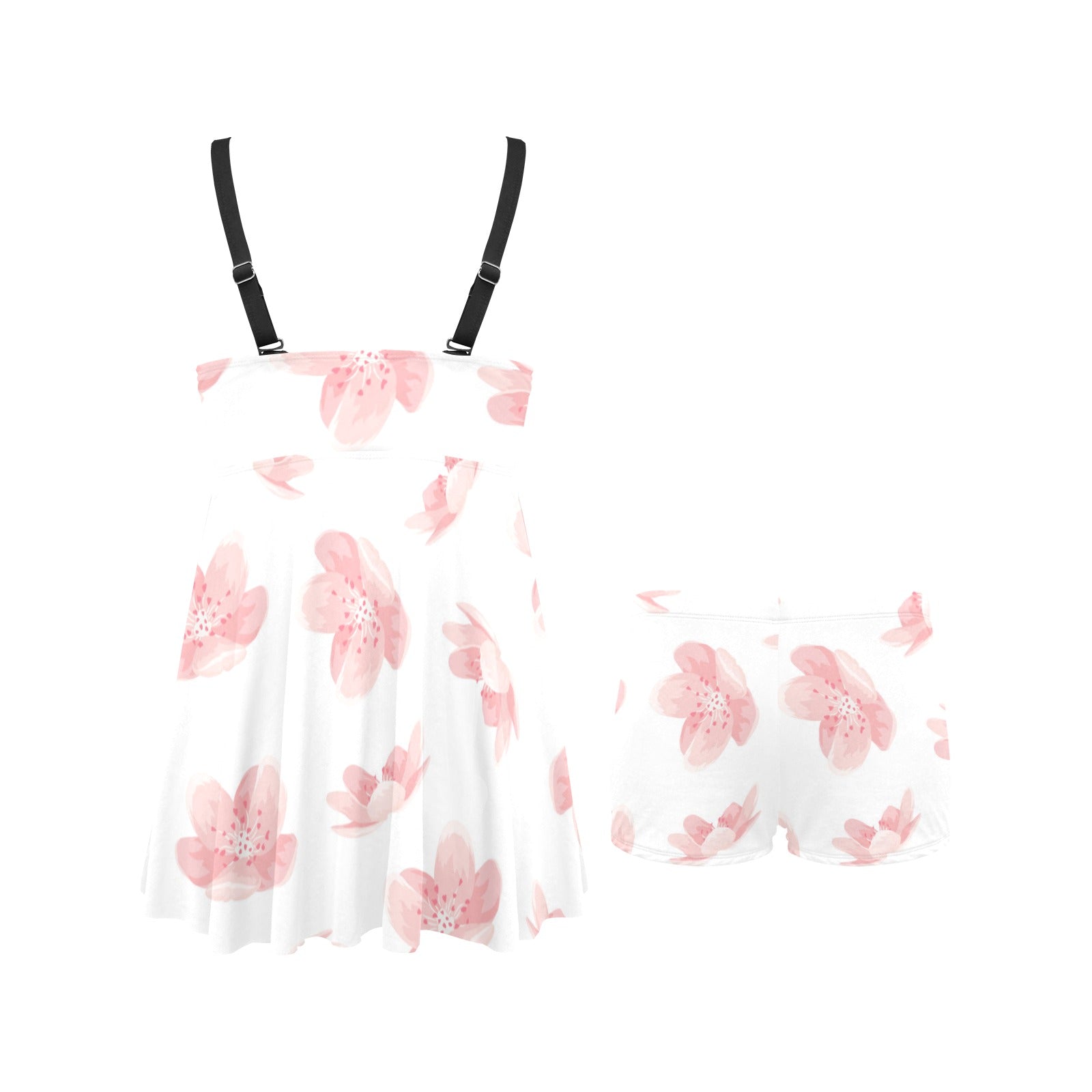 Pink sakura cherry blossom pattern Chest Sexy Pleated Two Piece Swim Dress