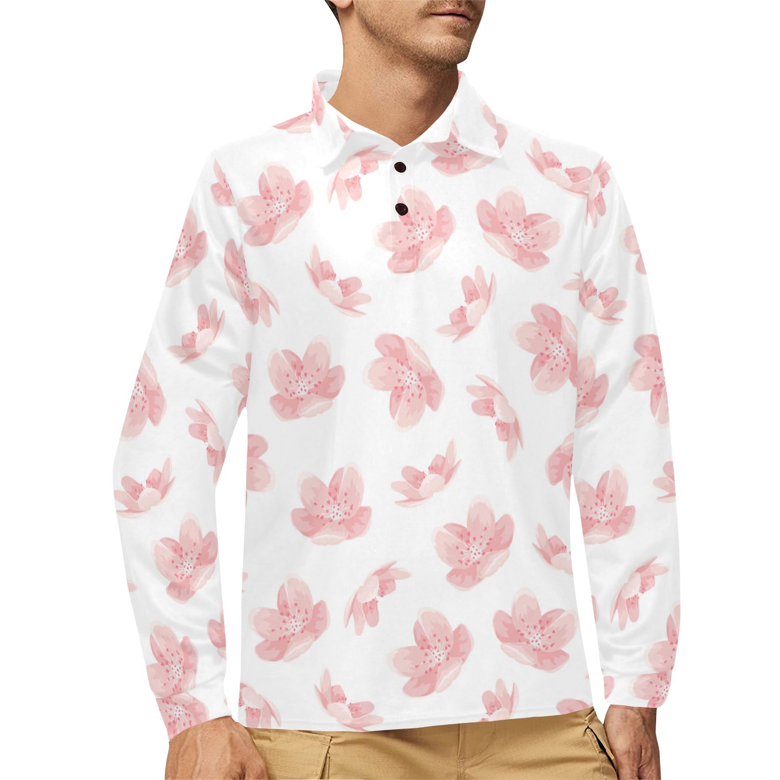 Pink sakura cherry blossom pattern Men's Long Sleeve Polo Shirt