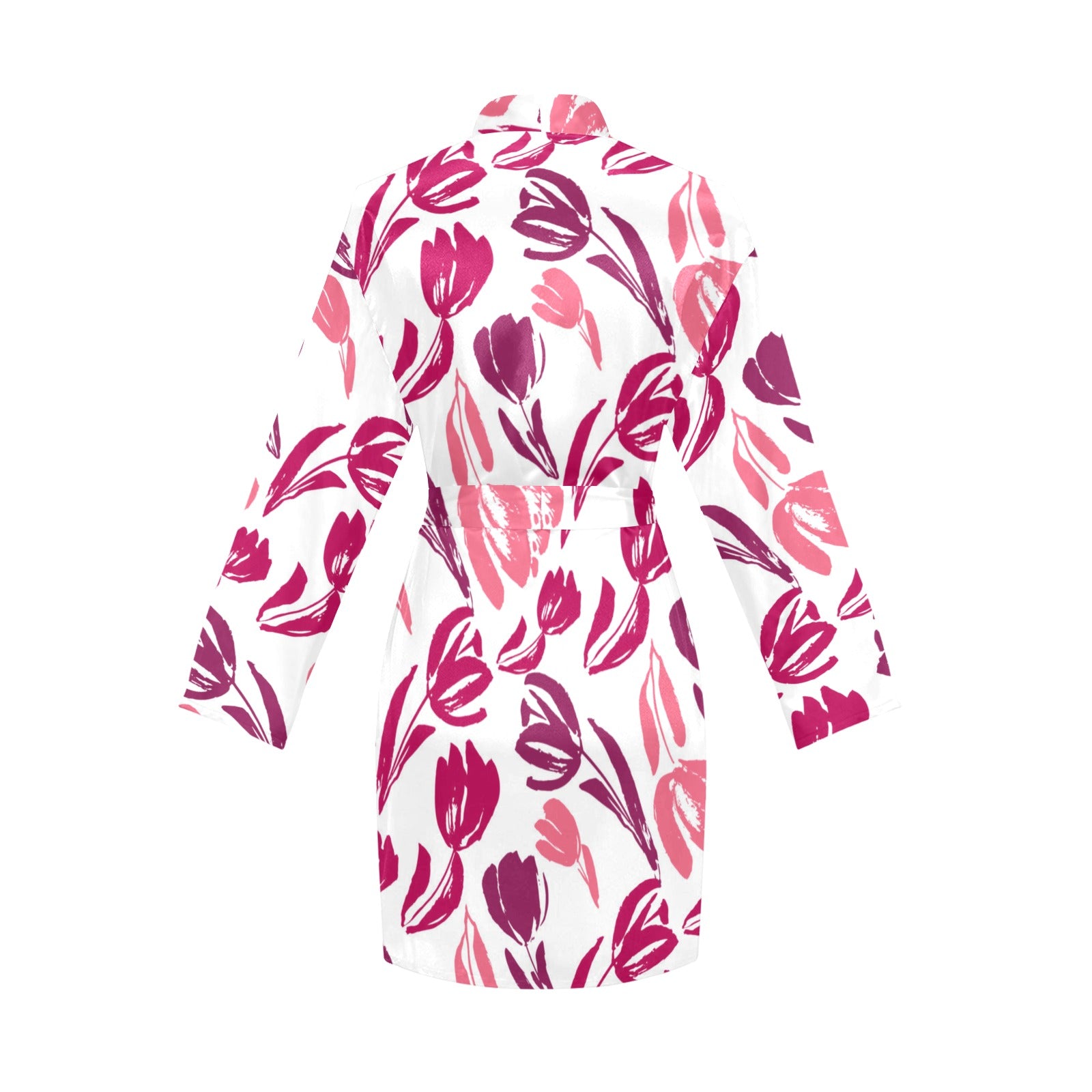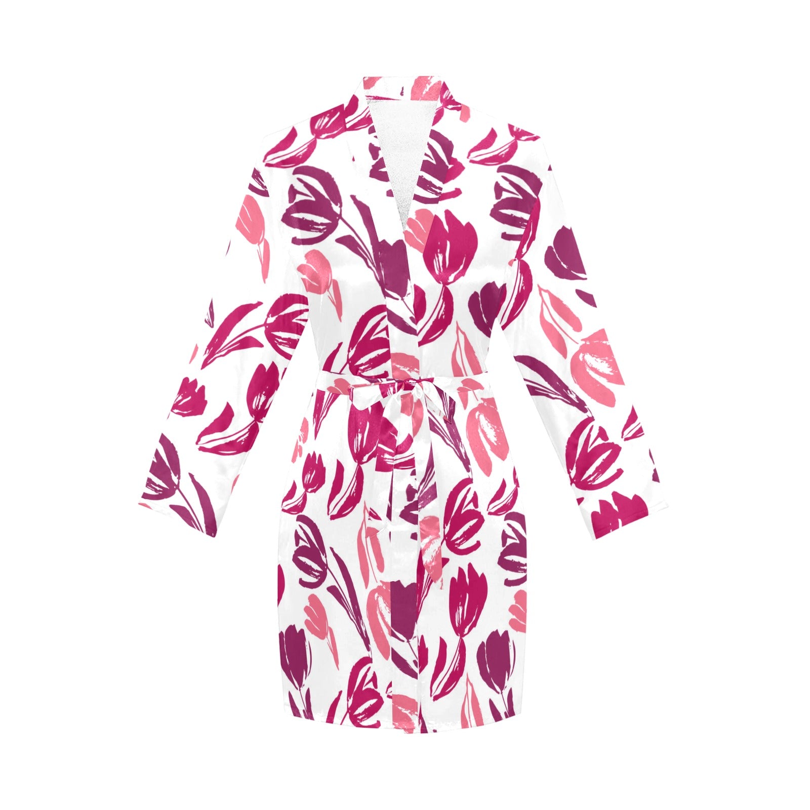 pink sketch tulip pattern Women's Long Sleeve Belted Night Robe