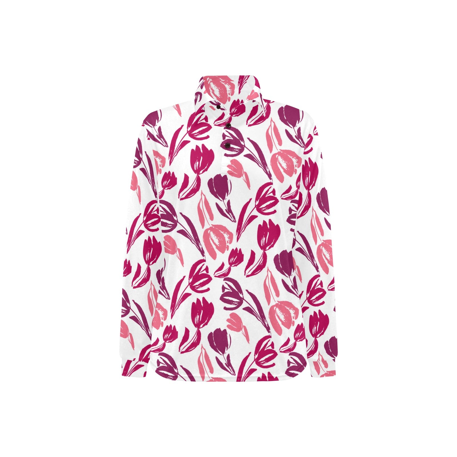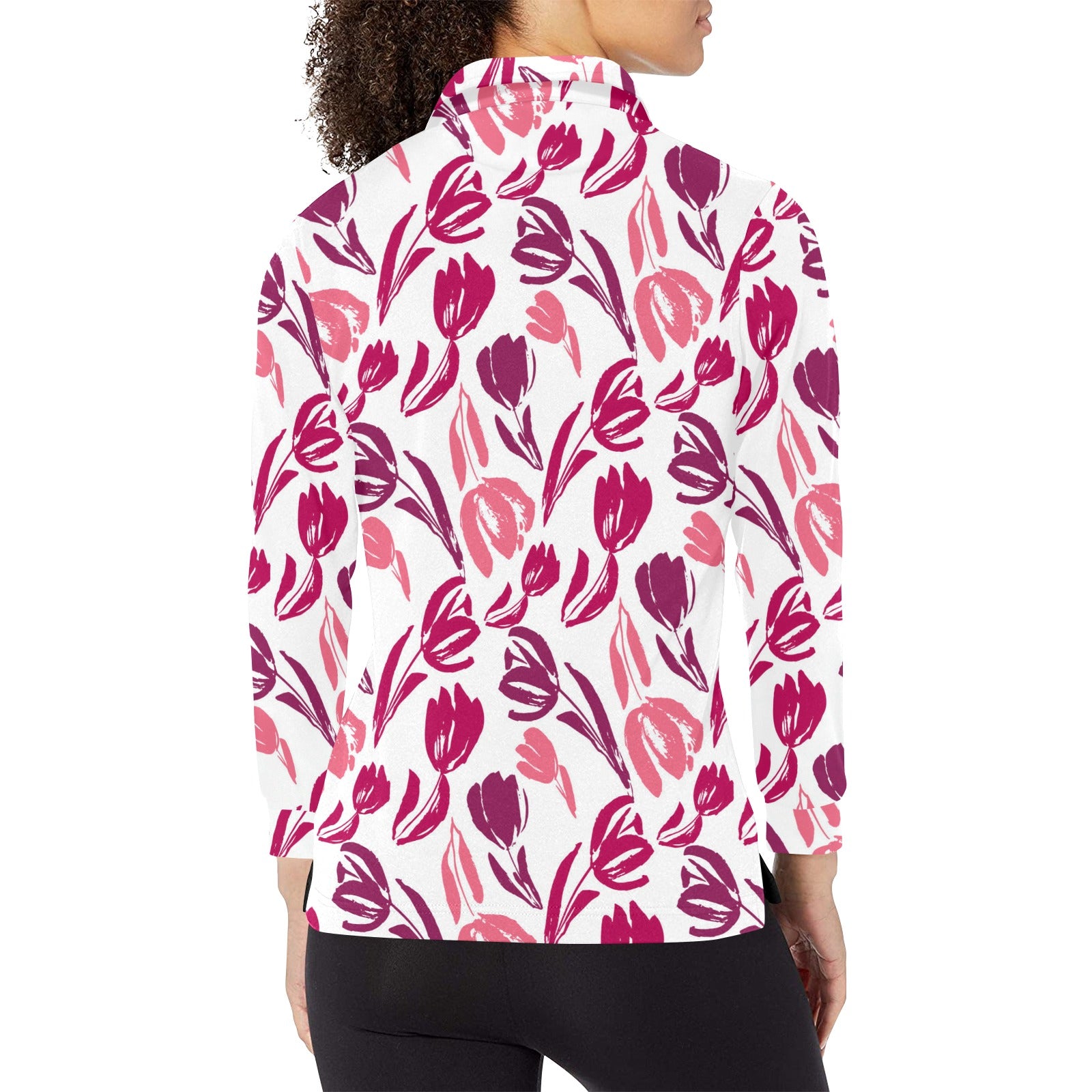 pink sketch tulip pattern Women's Long Sleeve Polo Shirt
