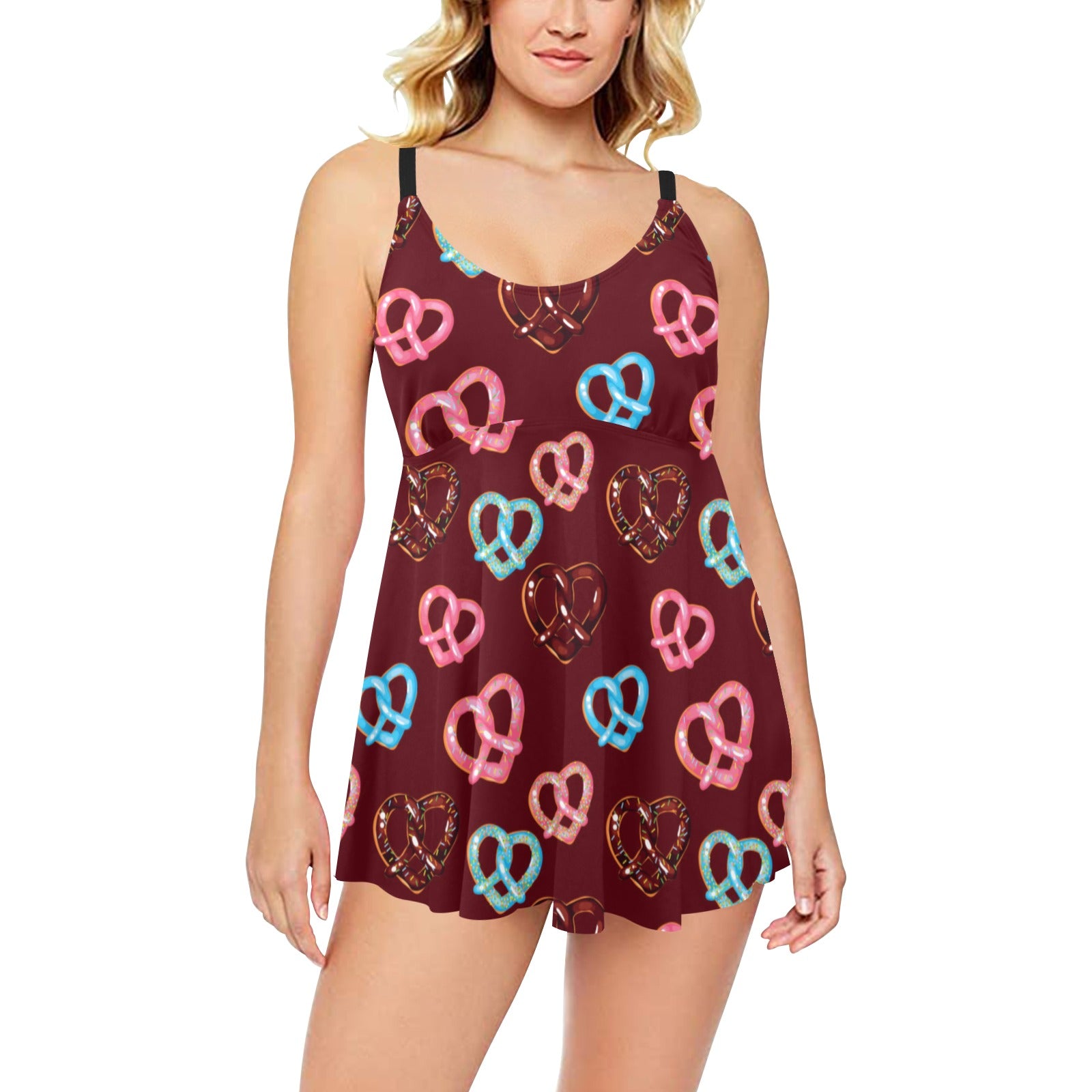 Pretzels Pattern Print Design 05 Chest Sexy Pleated Two Piece Swim Dress