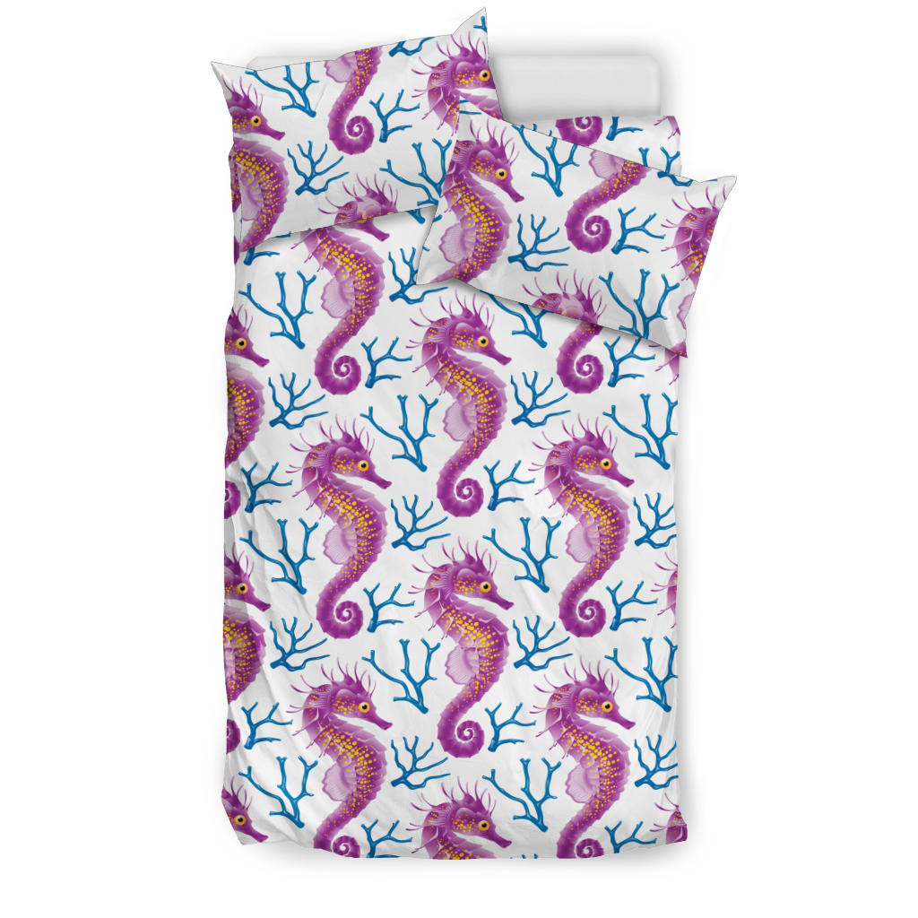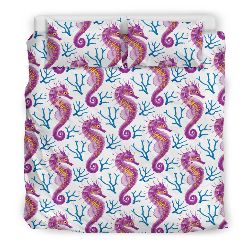 Purple seahorse blue coral pattern Bedding Set is a uniqued design and limited item. It made to order, hand printed, and sewn with love in our factory.