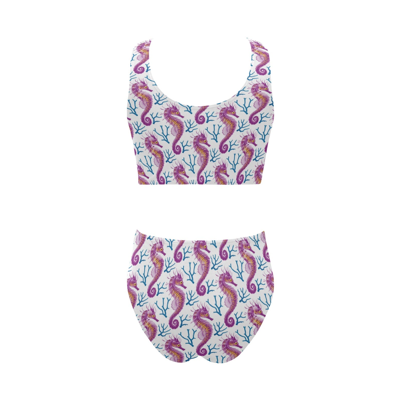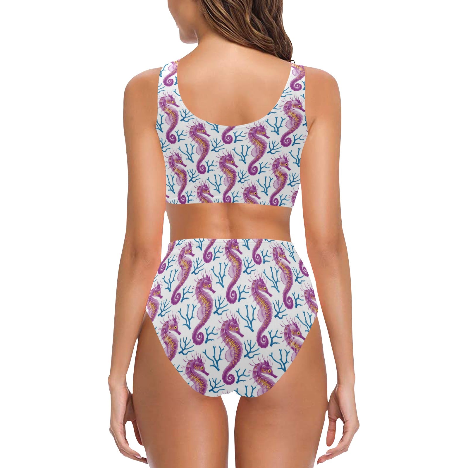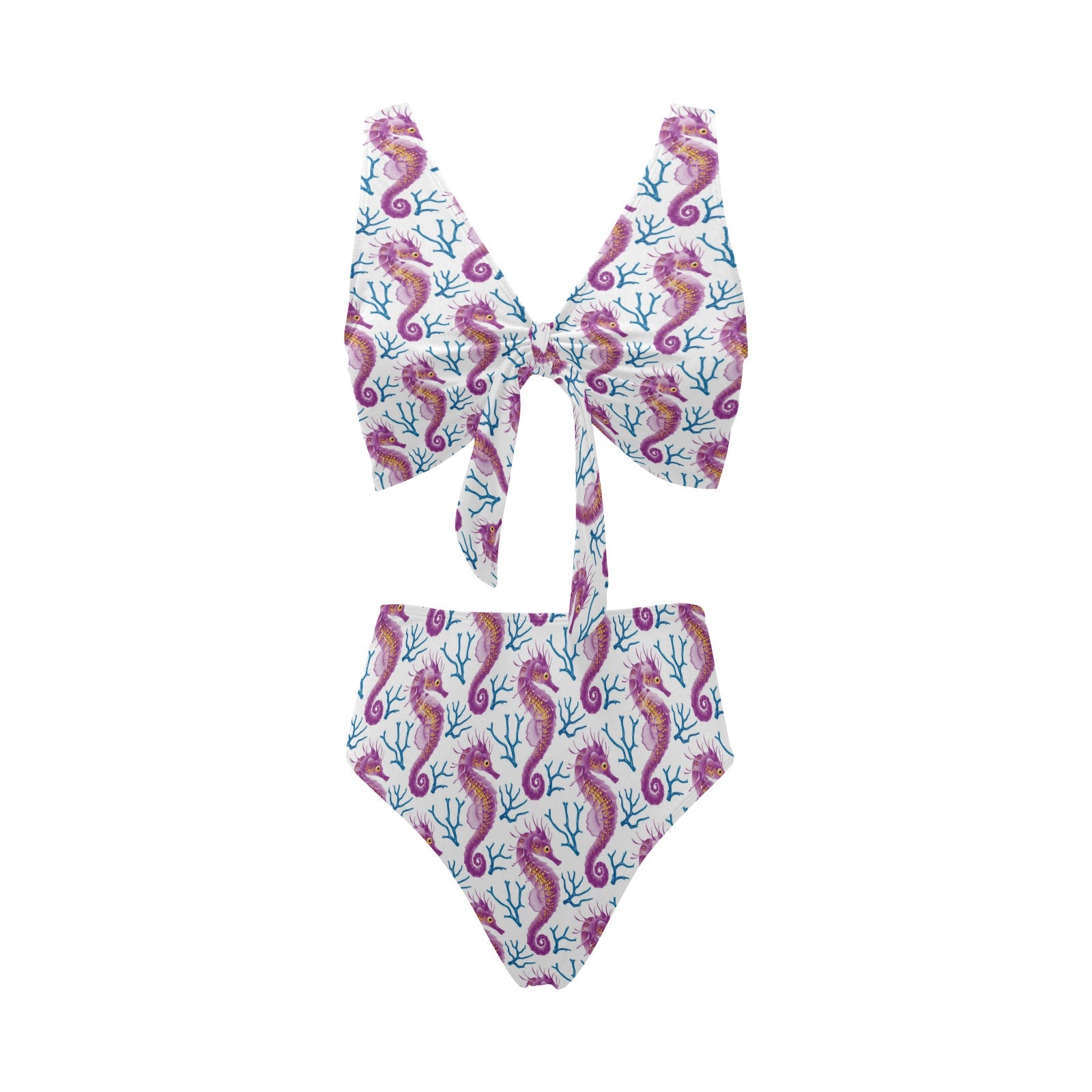 Purple seahorse blue coral pattern Chest Bowknot High Waisted Bikini Swimsuit