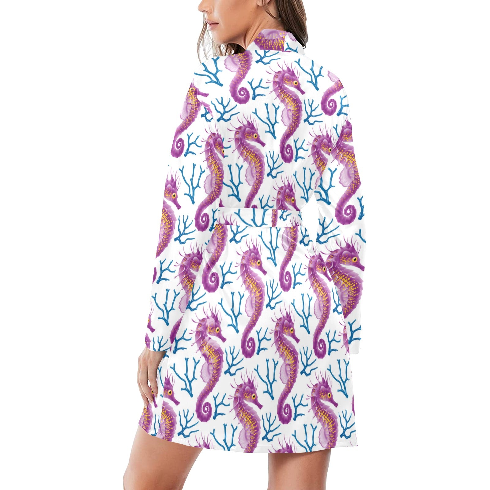 Purple seahorse blue coral pattern Women's Long Sleeve Belted Night Robe