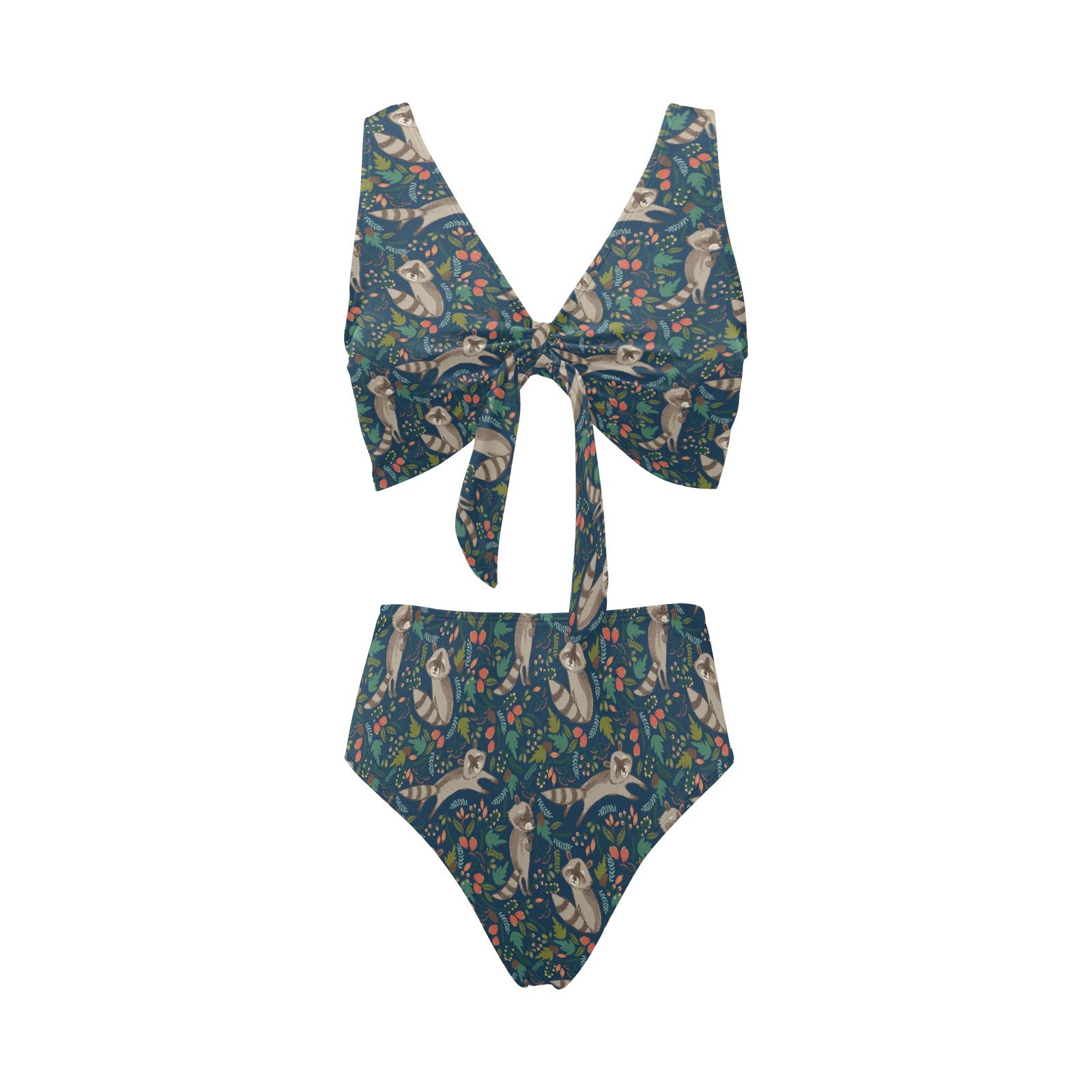 Raccoon tropical leaves pattern Chest Bowknot High Waisted Bikini Swimsuit