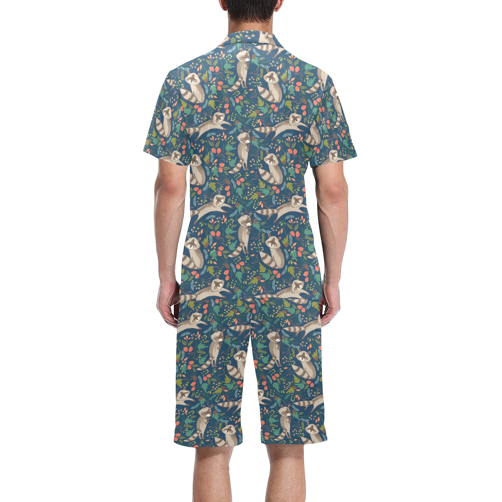 Raccoon tropical leaves pattern Men's V-Neck Short Pajama Set