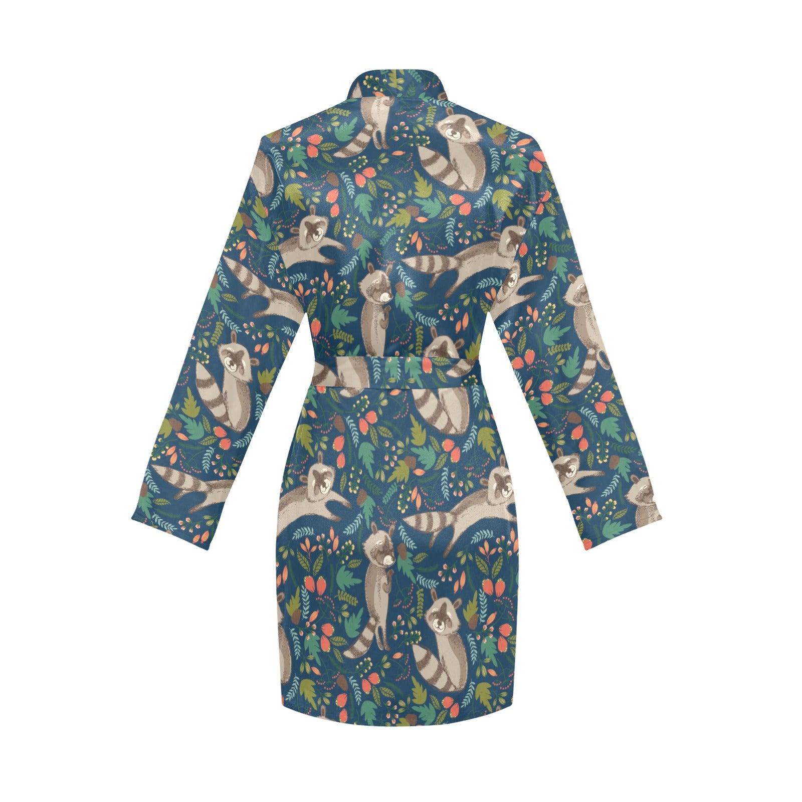 Raccoon tropical leaves pattern Women's Long Sleeve Belted Night Robe