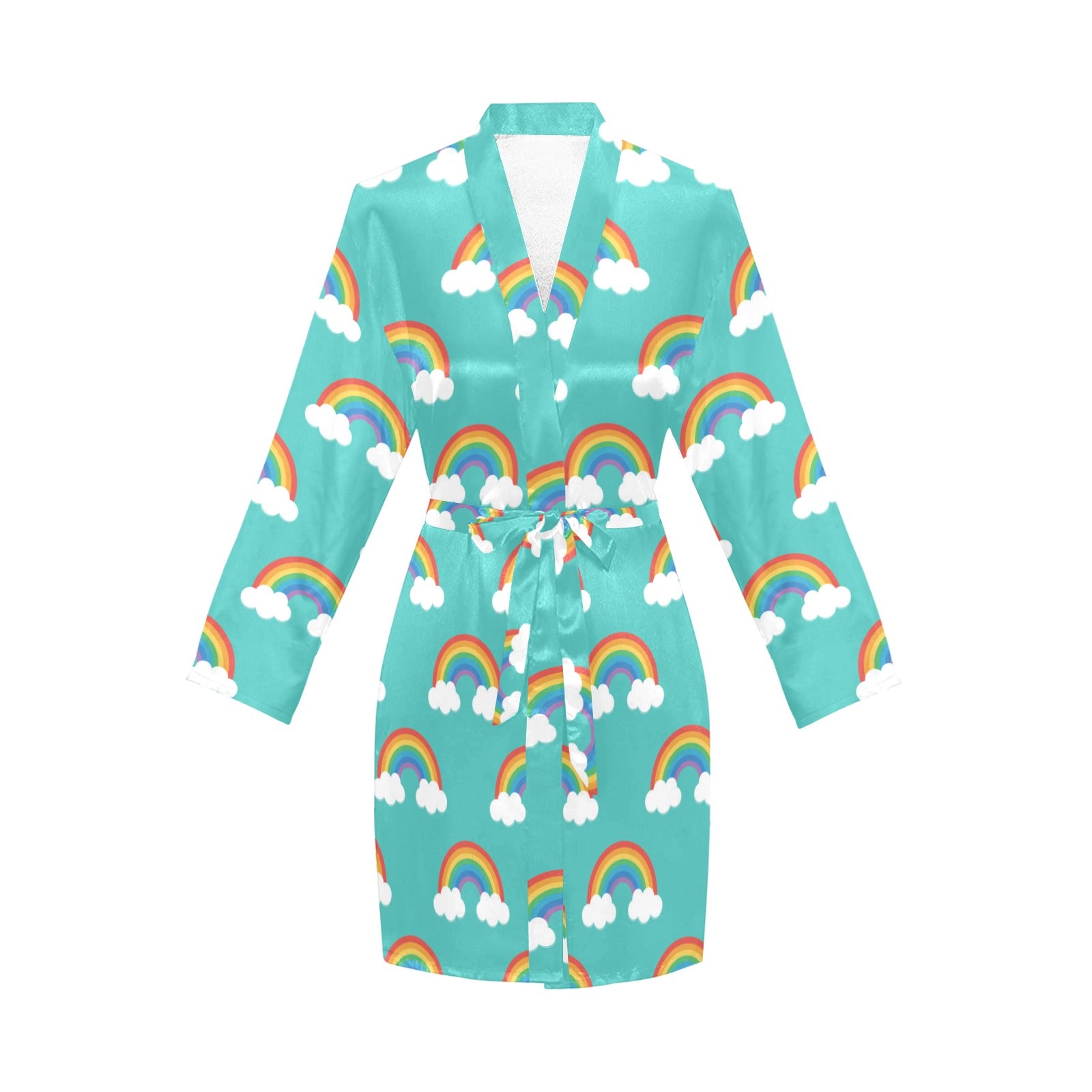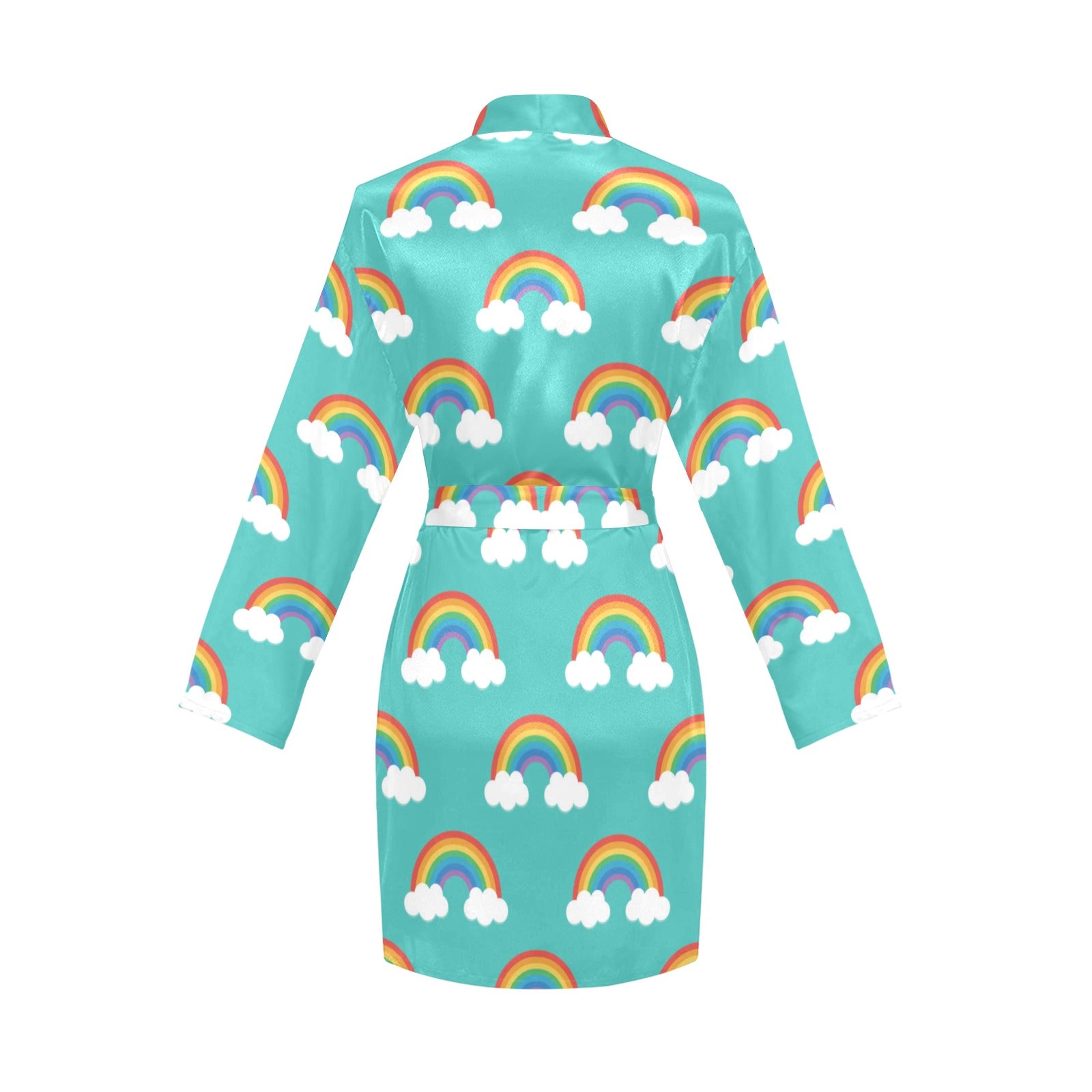Rainbow pattern green background Women's Long Sleeve Belted Night Robe